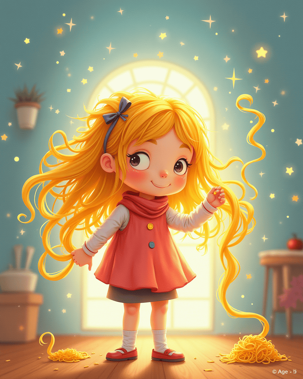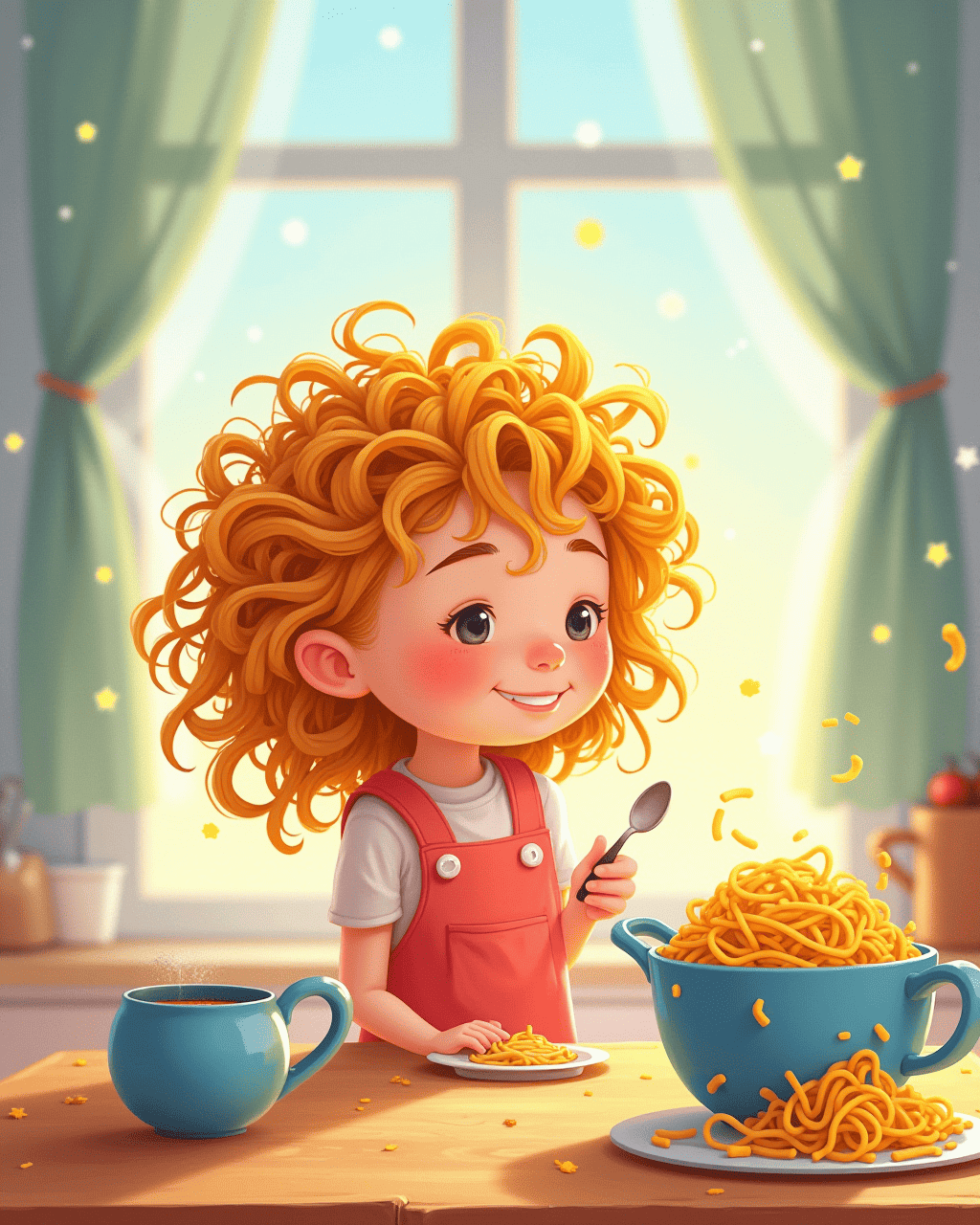 Lila wakes up early, dreaming of a bright day. She hops onto the kitchen counter to see her shiny spoon. A pot of fresh pasta waits, gleaming like tiny golden swords. She imagines a hairstyle that will surprise her family. The morning air smells like cinnamon and hope.