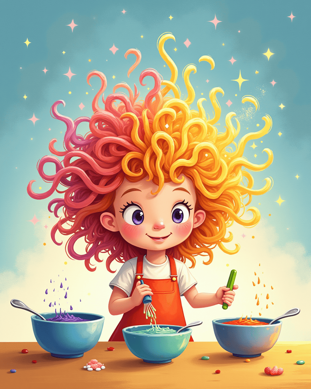 Lila pours red, blue, and yellow sauce into bowls. She stirs each one until a rainbow appears. She uses a green spoon to help stir in a magical leaf. The colors swirl like a paintbrush in a storm. Her hair begins to look like a pot of rainbow soup.