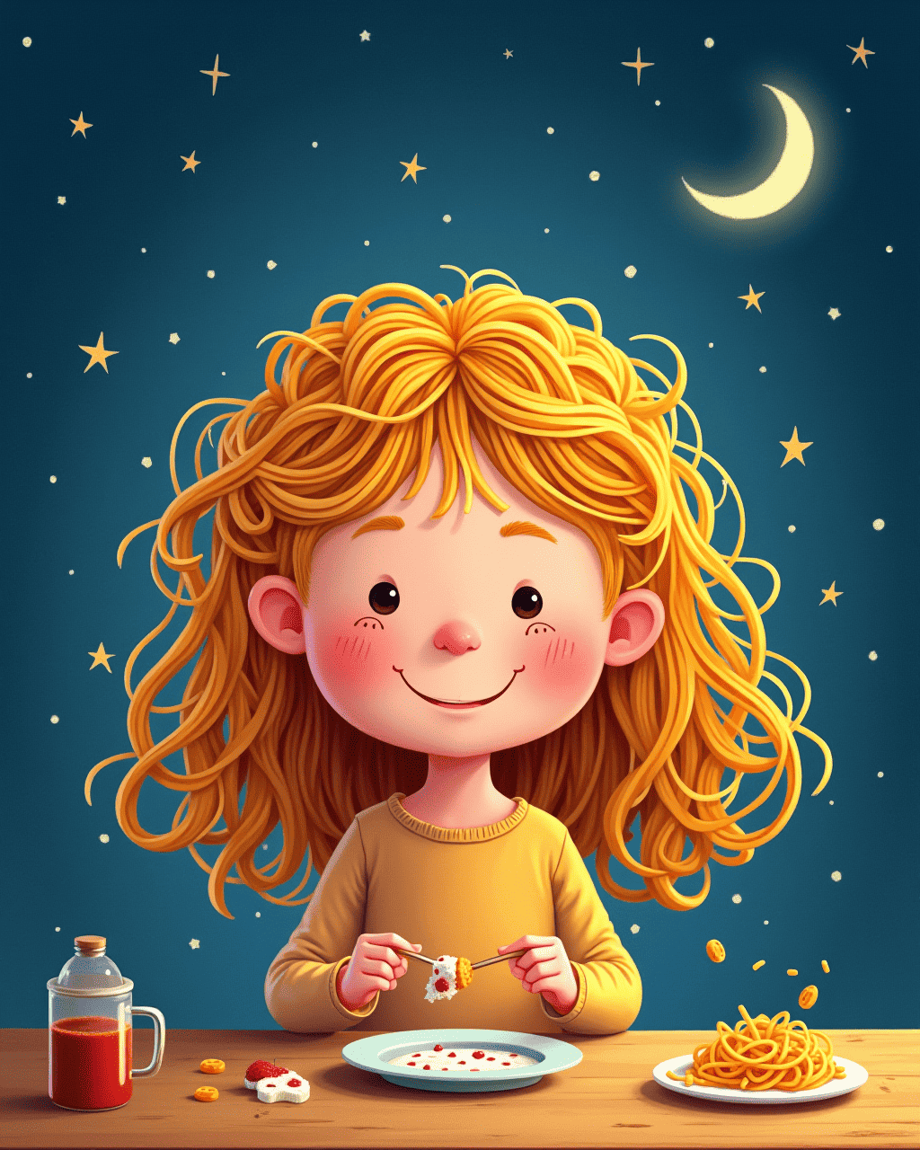 Lila tries to braid the spaghetti into a crown. The noodles get tangled and tumble like dominoes. She laughs and wipes the spaghetti out of her hair. A tiny bite of sauce falls near her cheek. Lila smiles, deciding this is just the start.