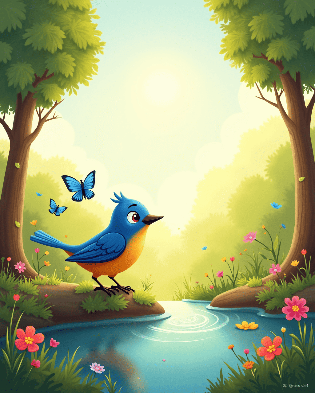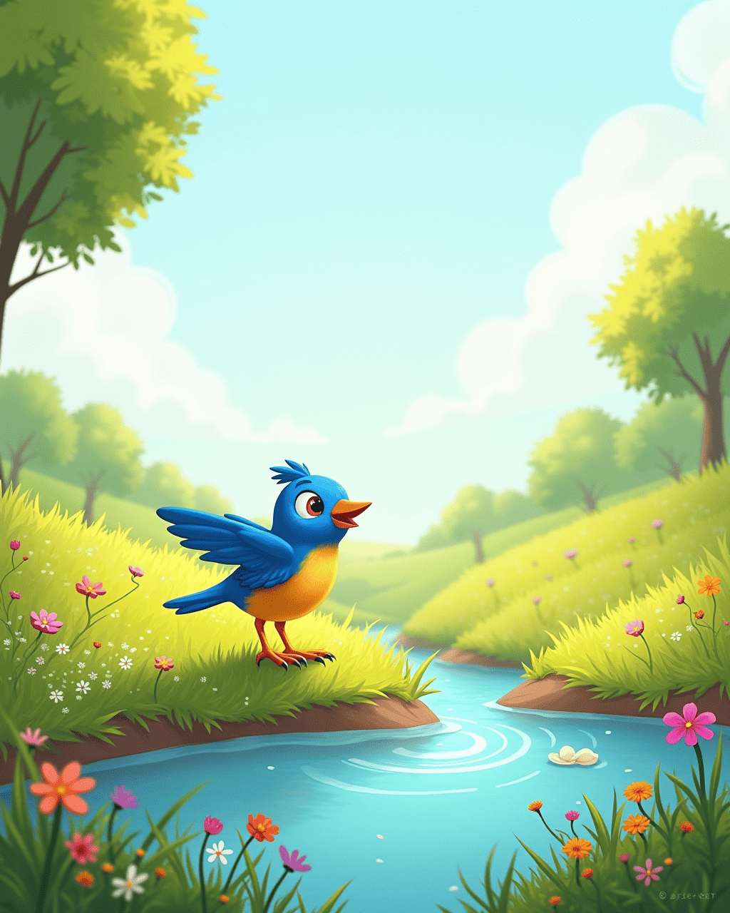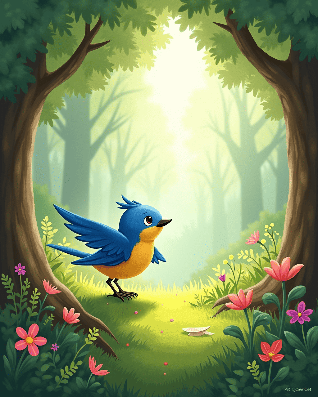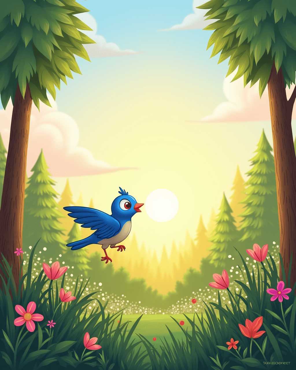 The sun rose over the emerald forest, painting the sky with hues of pink and gold. In a clear, silver spring, a tiny bluebird called Lila fluttered, eager to start her day. Lila had heard the forest elders speak of a secret place where birds could bounce higher than the clouds. Determined to find it, she perched on a tall pine and decided to spread her bright wings toward the bright horizon. With a hopeful chirp, she leapt, feeling the wind kiss her feathers and she began her adventurous bounce.