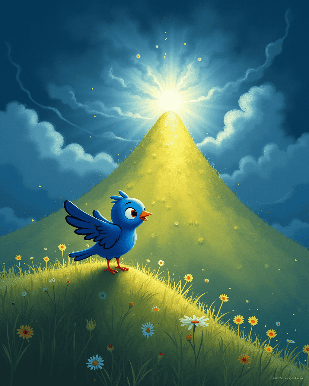 After days of bouncing, Lila finally spotted a distant hill that shimmered with golden dust. The hill’s slope was gentle, but clouds brushed its peak, giving it a hint of mystery. Lila perched at the foot, feeling the wind swirl, and decided it was her final trial. She took a deep breath, then flapped her wings with all her might, soaring upward with a series of energetic hops. The hill's summit welcomed her with a burst of rainbow-colored light, confirming her triumph.