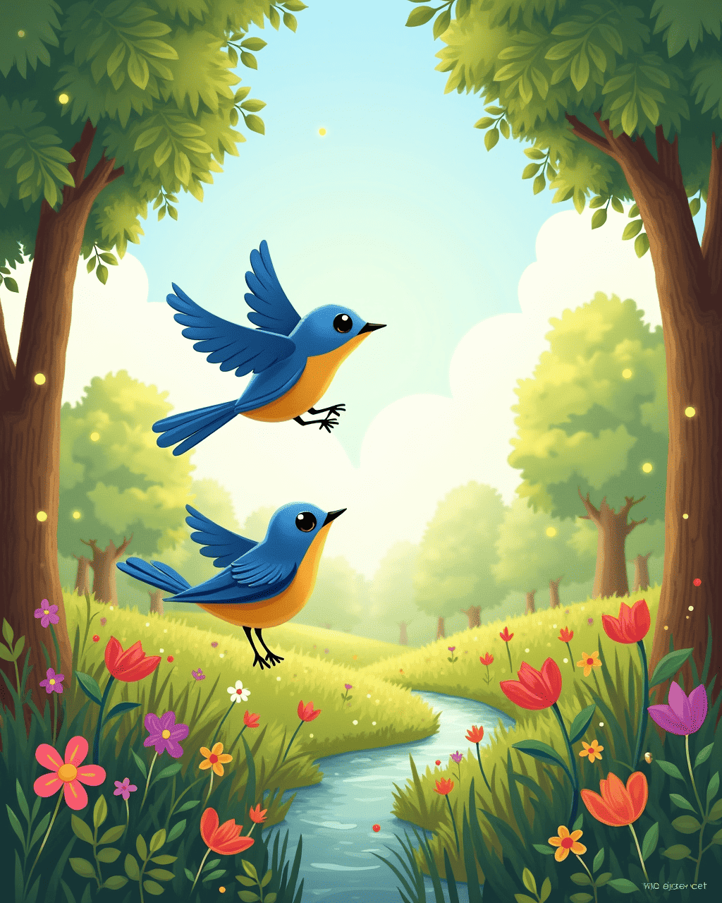 When dawn came again, Lila perched on the same spring, now glinting brighter than ever. She remembered the journey, the quiet moments, and the joyous leaps that filled her heart. As she sang a sweet lullaby, the forest welcomed her with smiles that warmed her wings. She understood that the greatest adventure is the one you share with friends, even if it’s just a bouncing song. And so, each day, Lila sang and bounced, ever ready for the next sunrise.