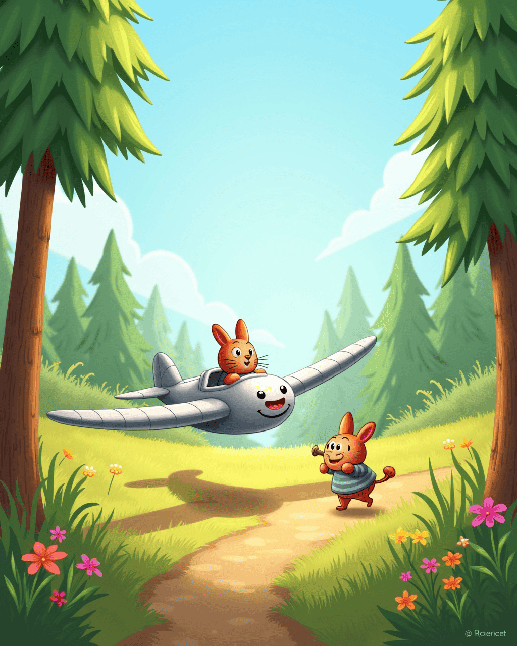 Lily and Max were hopping through a sunlit clearing when they spotted something glimmering between the tall pines. It was a silver glider with a bright, giddy smile painted on its side. Max squeaked excitedly, “Let’s see what it can do!” Lily nodded, her whiskers twitching with anticipation. They gently nudged the glider, and it sprang to life, flapping its wings with a joyful chirp. The forest seemed to hold its breath as the glider lifted off the dirt and drifted into the clear blue sky.