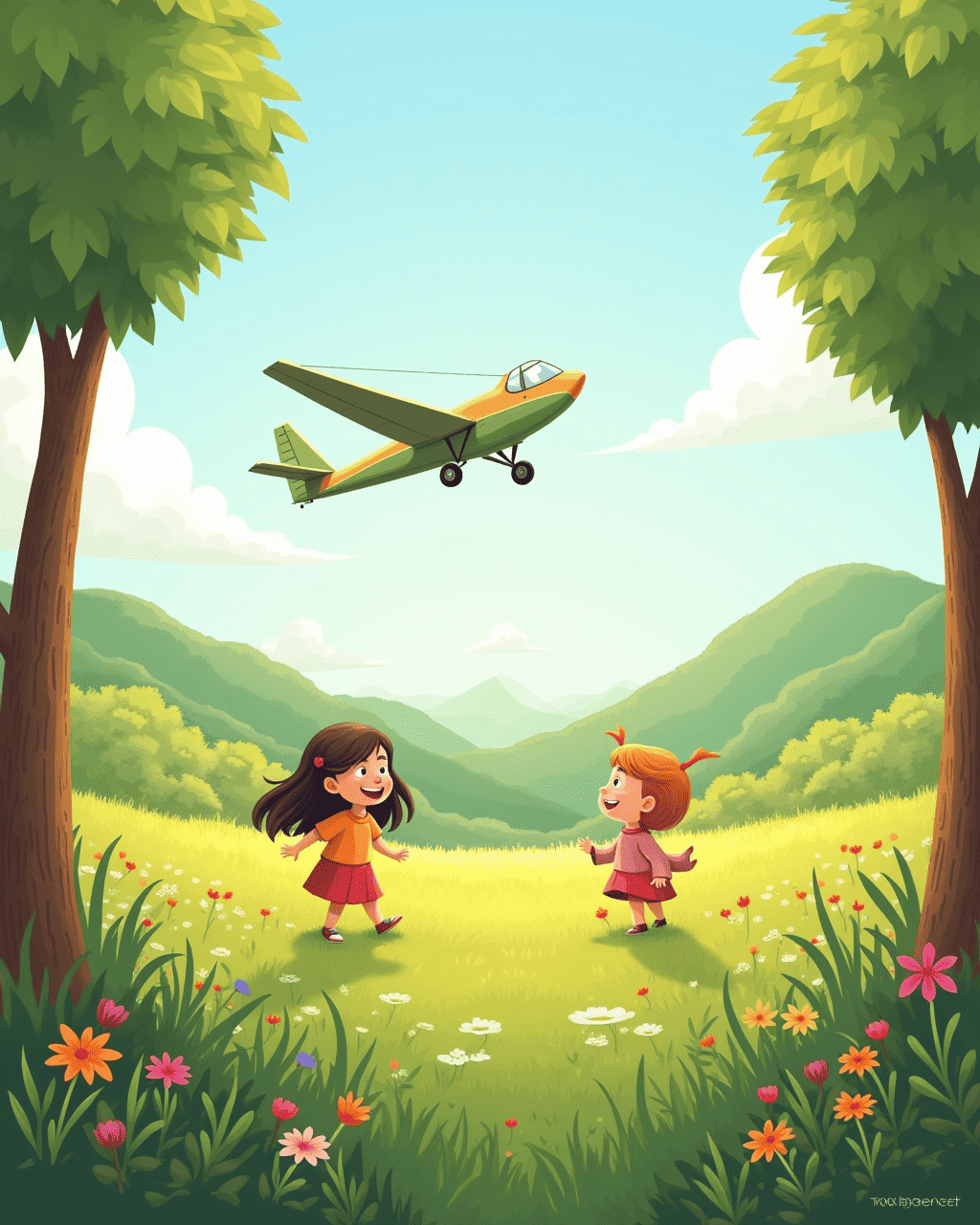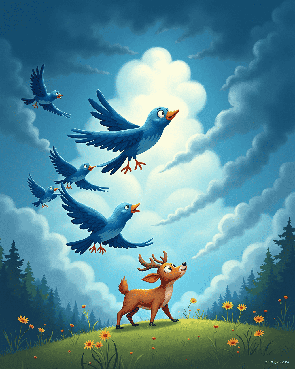 While soaring higher than ever, a flock of bright blue birds joined their path. The birds tilted their heads, curious about the glider’s presence. Lily shouted, “We’re friends!” and Max joined in, “Let’s explore together.” The flock guided them to a hidden glen where a friendly deer waited, offering them a trail of rainbow seeds.