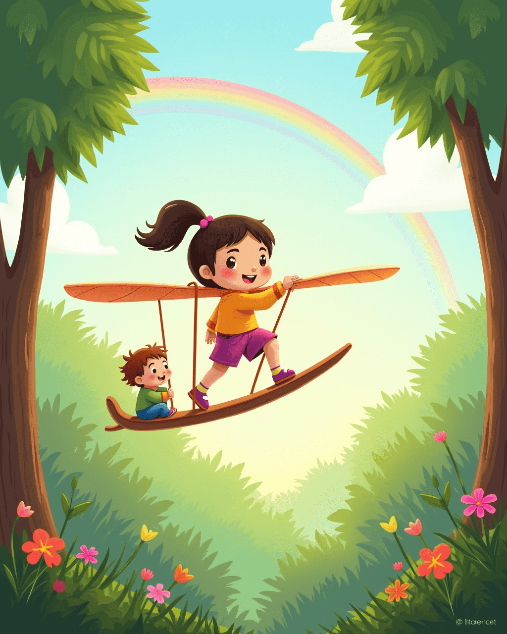 Lily held onto the glider’s sturdy handle while Max perched on a low branch. The glider began to glide smoothly over the forest canopy. Far below, a rainbow arched across the sky like a golden ribbon. The pair swooped under it, feeling the wind brush against their faces. Their hearts beat in rhythm with the rhythmic flutter of the glider’s wings.