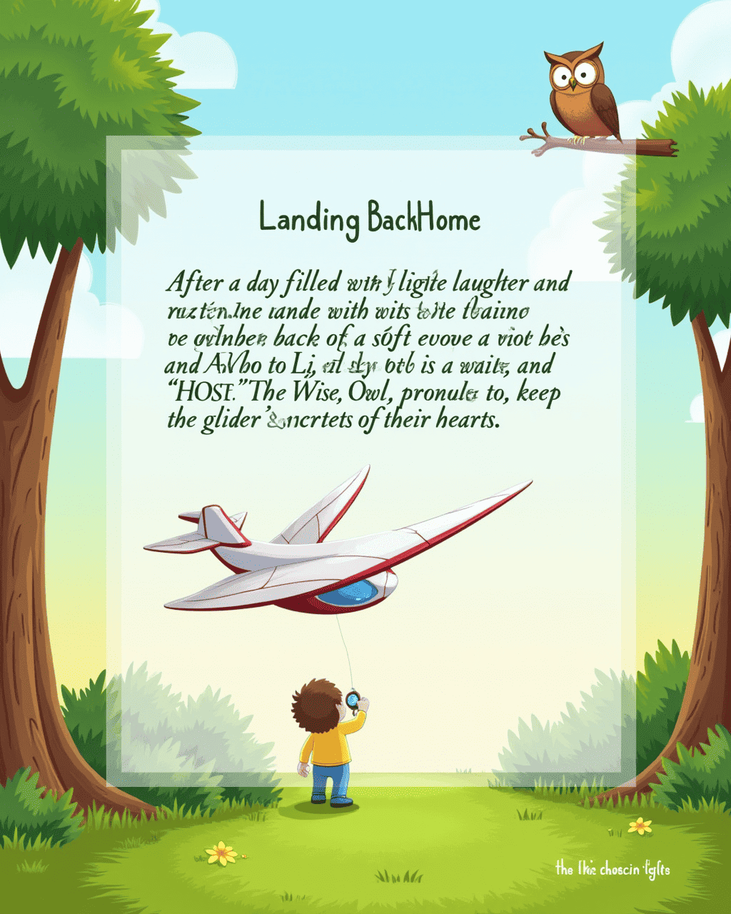After a day filled with laughter and flight, the glider gently descended back into the clearing. Lily and Max landed with a soft thud onto a bed of moss. The Wise Owl perched on a nearby branch and hooted, “Remember, the sky is vast but your heart is vaster.” The friends nodded, thanked the Owl, and promised to keep the glider’s secrets in their hearts.