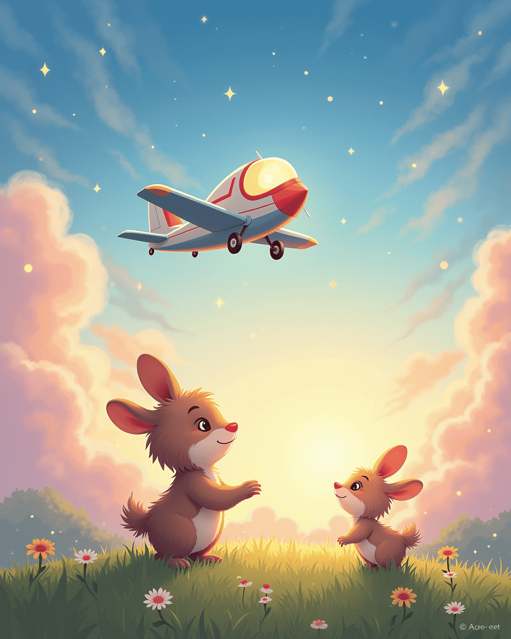 As twilight painted the sky with hues of pink and gold, Lily and Max said their goodbyes to the giddy glider. It faded gently into the clouds like a dream dissolving at dawn. Max whispered, “Until next time, little friend.” Lily, with a grin, hopped back to her burrow, where she would dream of future flights.