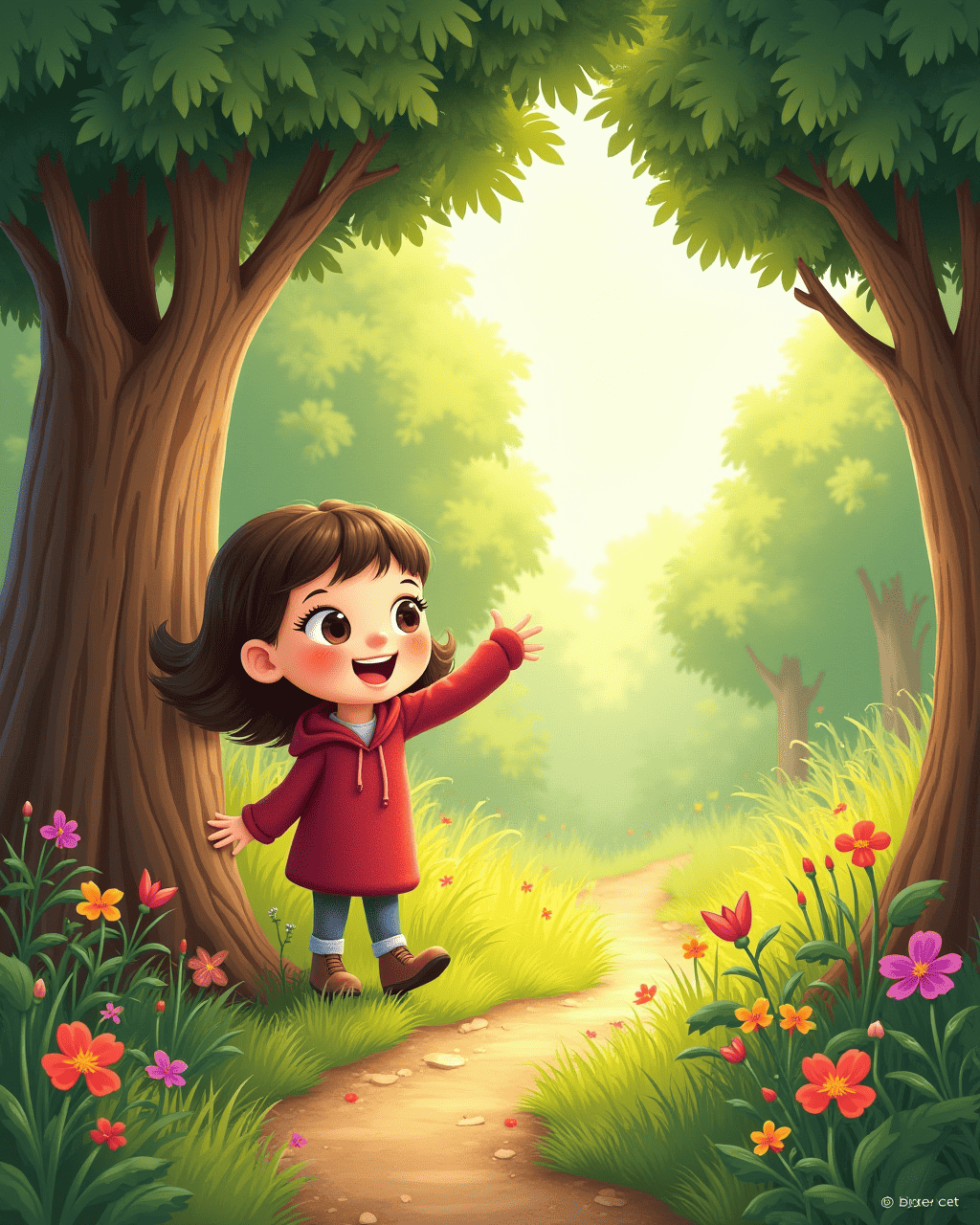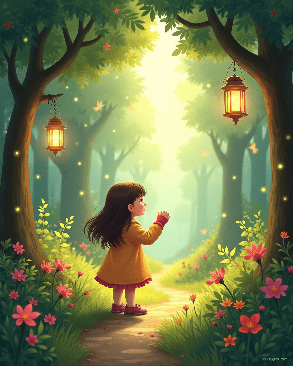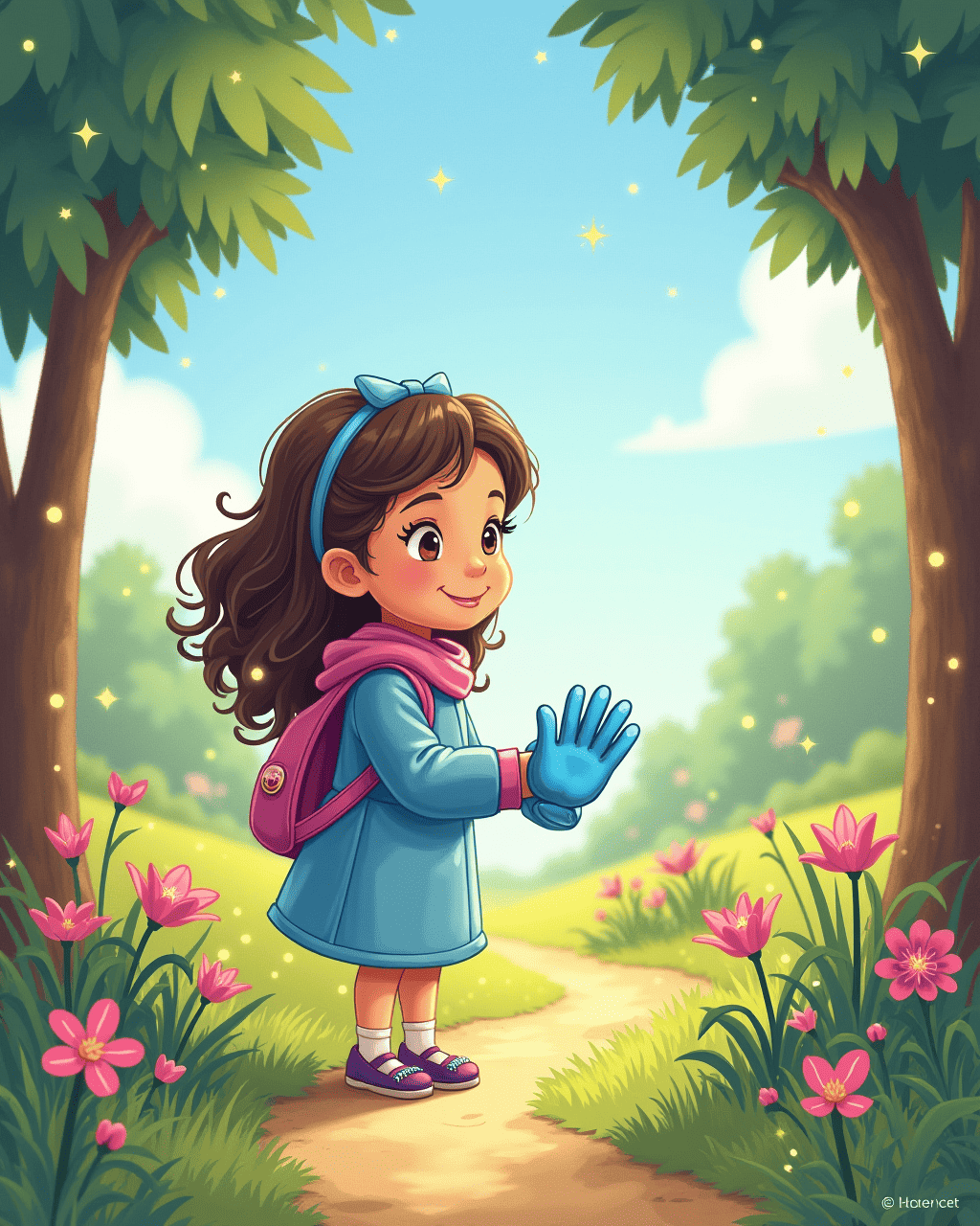 Emma stepped outside, glove clasped tightly, and was instantly surrounded by a shimmering forest. The trees sang with rustling leaves, and tiny lanterns hung from branches, glowing softly. Birds chirped harmoniously, guiding her path. The glove’s giggles grew louder, leading her deeper into the woods.