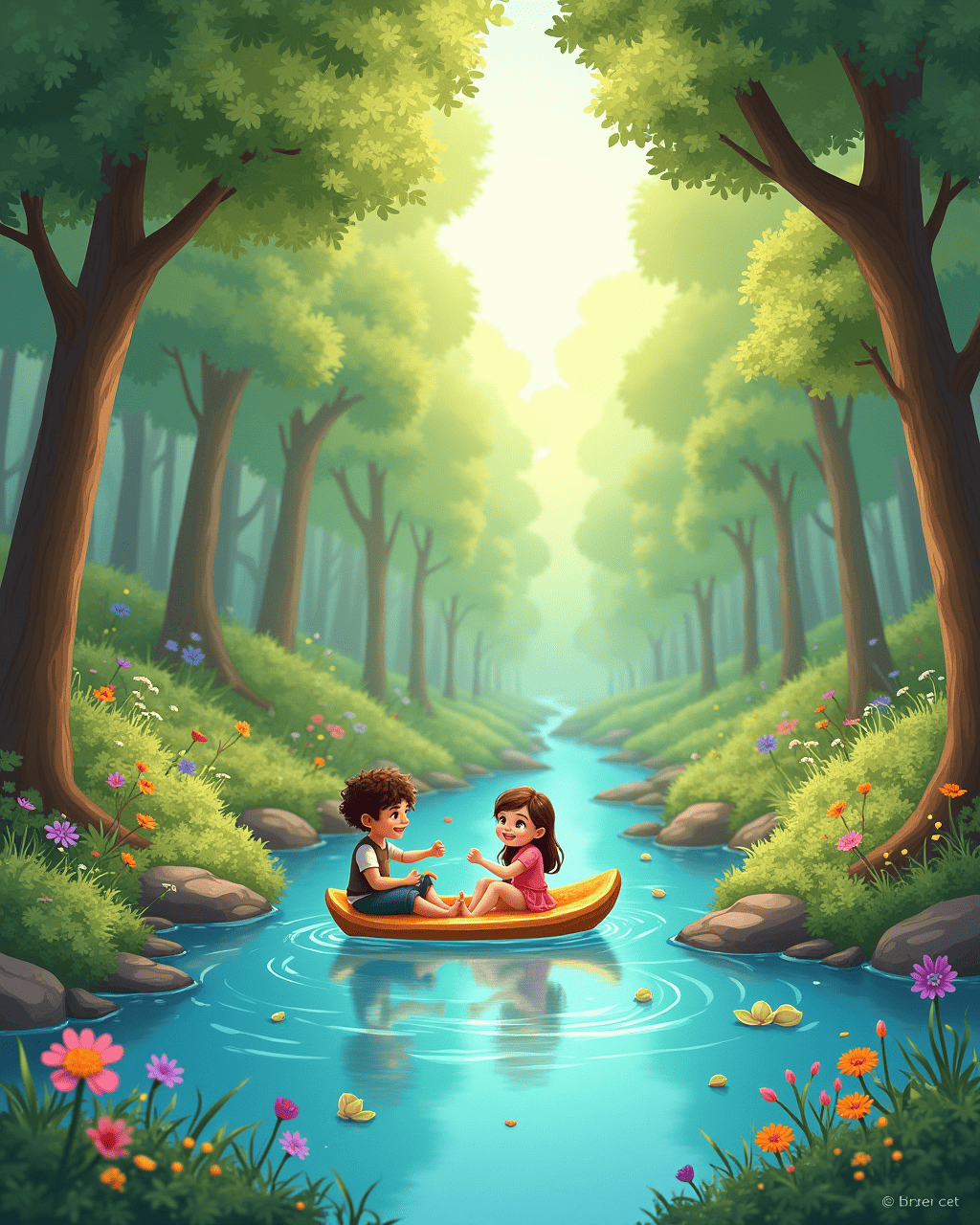 Through the forest, they reached a crystal‑thin river. The water shimmered, a rainbow of colors reflected on its surface. The gloved fingers twitched as it glided across the water, and a gentle hum filled the air. Emma steered carefully while Felix splashed to keep pace, and together they crossed to the other side.