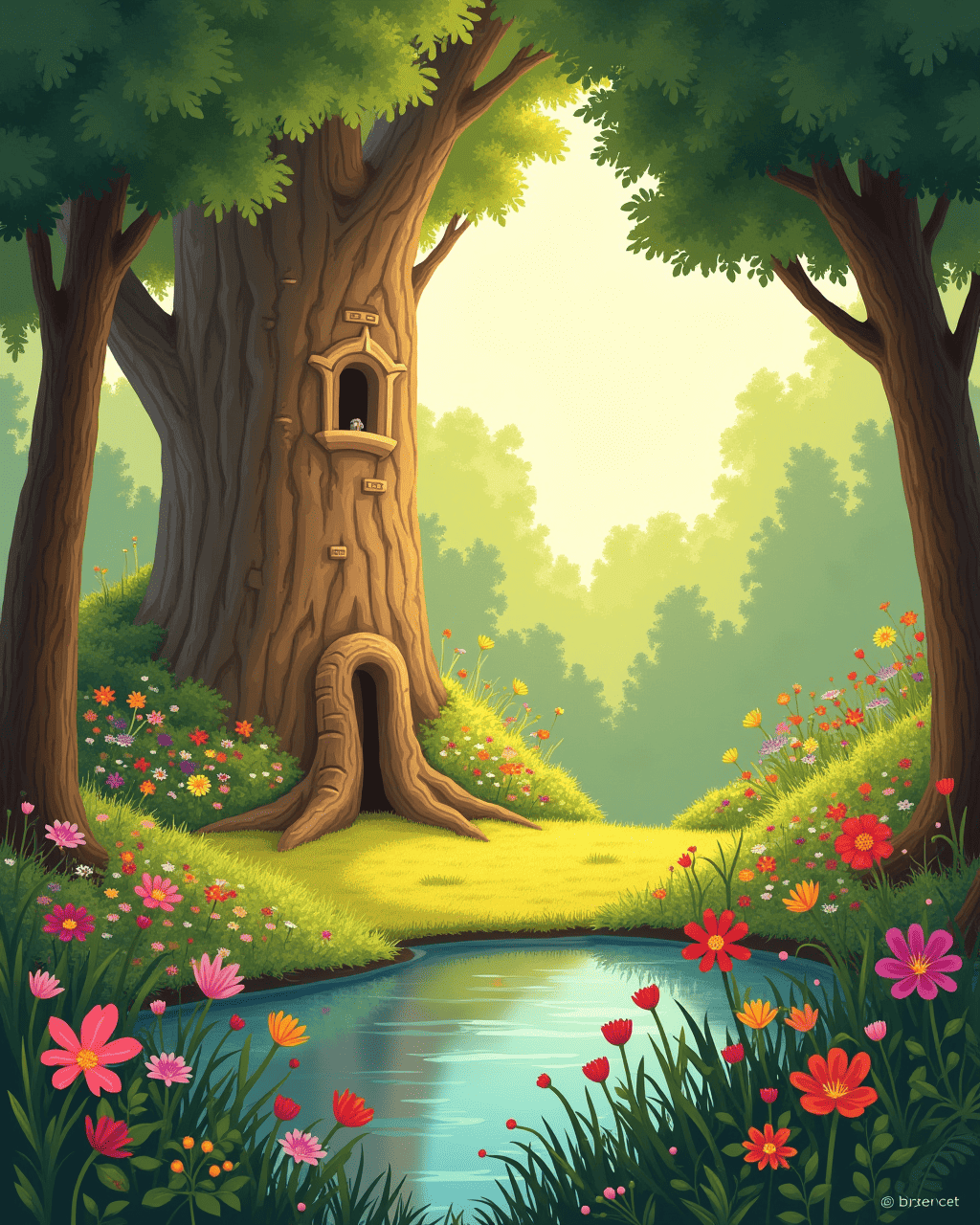 On the opposite shore, a hidden grove burst into bloom. Flowers of every hue danced in the breeze, and a soft golden light bathed the clearing. A mysterious old oak stood tall, its bark etched with ancient runes. The glove trembled, whispering, "We’re close enough to the heart of the forest."