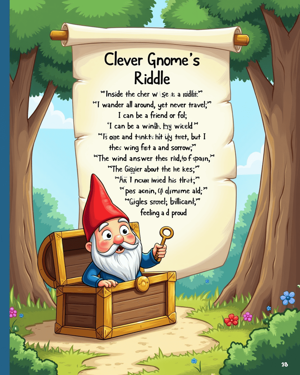 Inside the chest lay a scroll with a riddle: I wander all around, yet never travel; I can be a friend or foe, but I bring both joy and sorrow. Giggles pondered, thinking about the wind and the tree. The wind answered the riddle, and the chest popped open. Inside, a golden key glimmered brilliantly. Giggles smiled, feeling clever and proud.