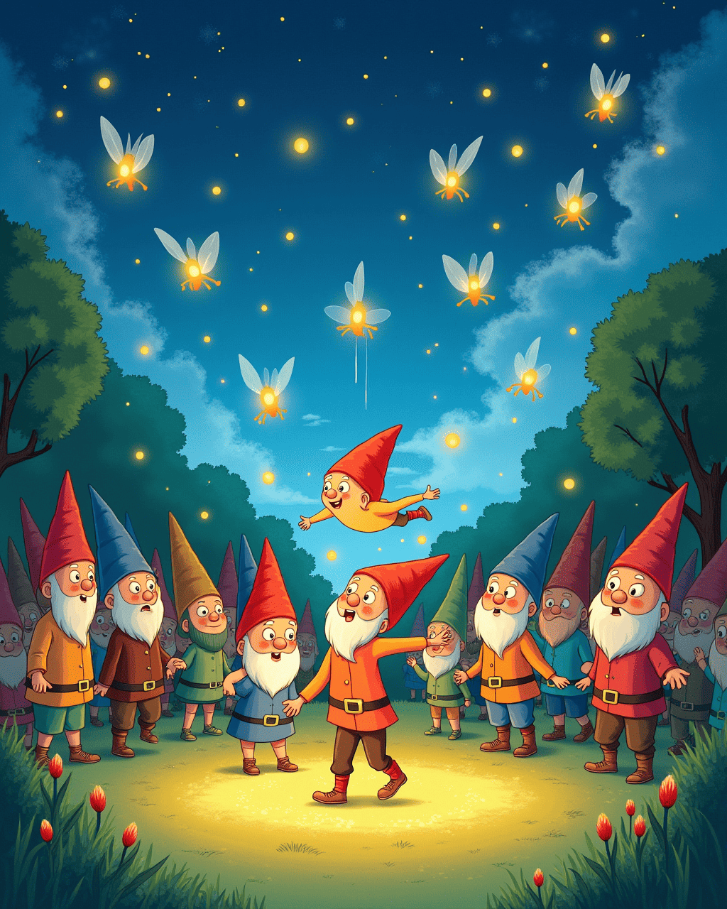 When morning arrived, Giggles returned to his cozy mushroom house. He recounted his tale to the garden creatures, who listened with wide eyes. He shared the treasure, and all enjoyed a picnic of berries. The garden thrummed with happiness, echoing his bright giggles. Giggles slept contentedly, already dreaming of his next adventure.
