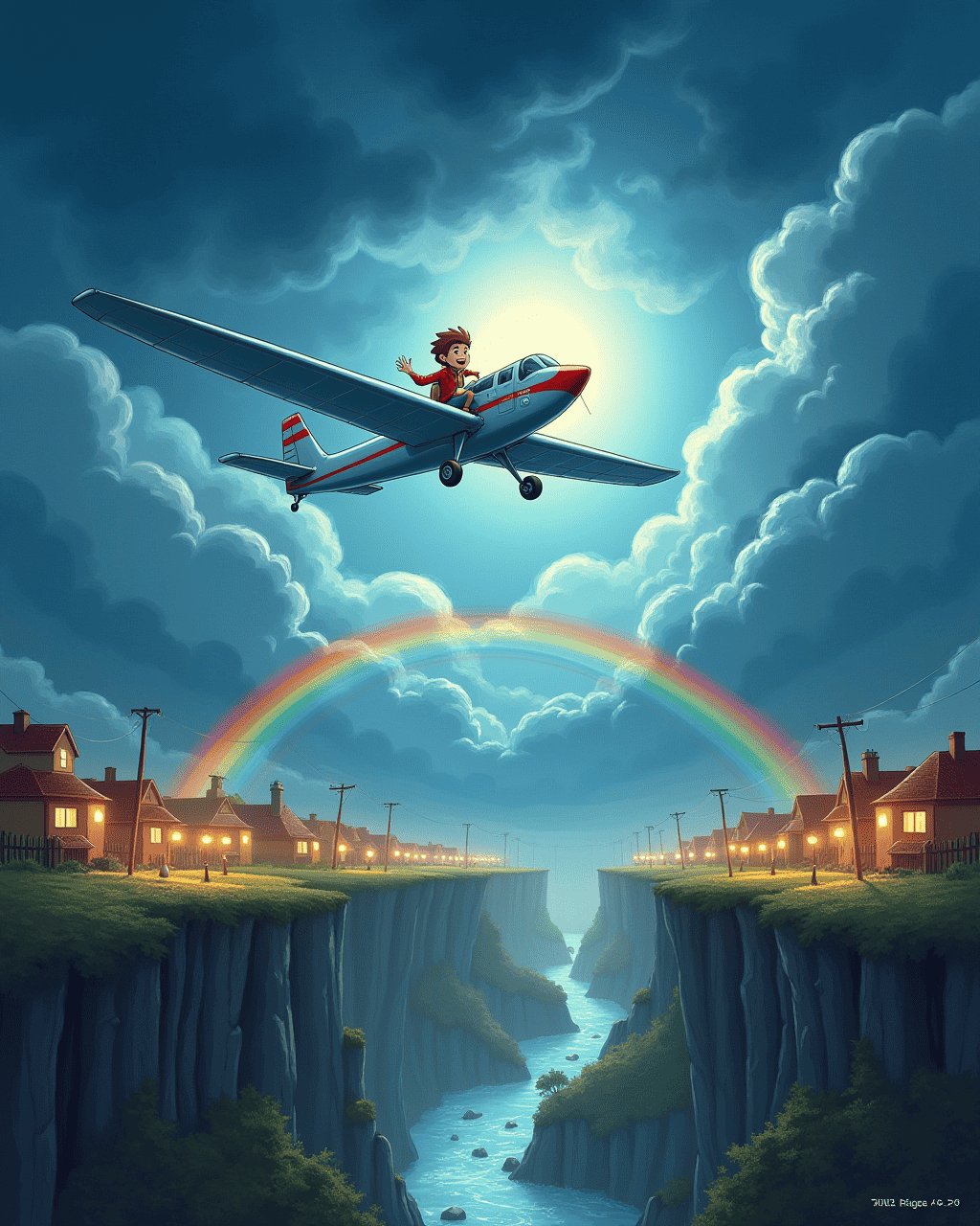 The glider rose smoothly, cutting through the clouds like a silver arrow. Jack flew above the town, seeing rooftops blinking like fireflies. Suddenly, a rainbow bent low, offering a path across the canyon. He followed the brilliant arch, marveling at the colors. The glider responded to his thoughts, swooping gracefully over the canyon’s edge.