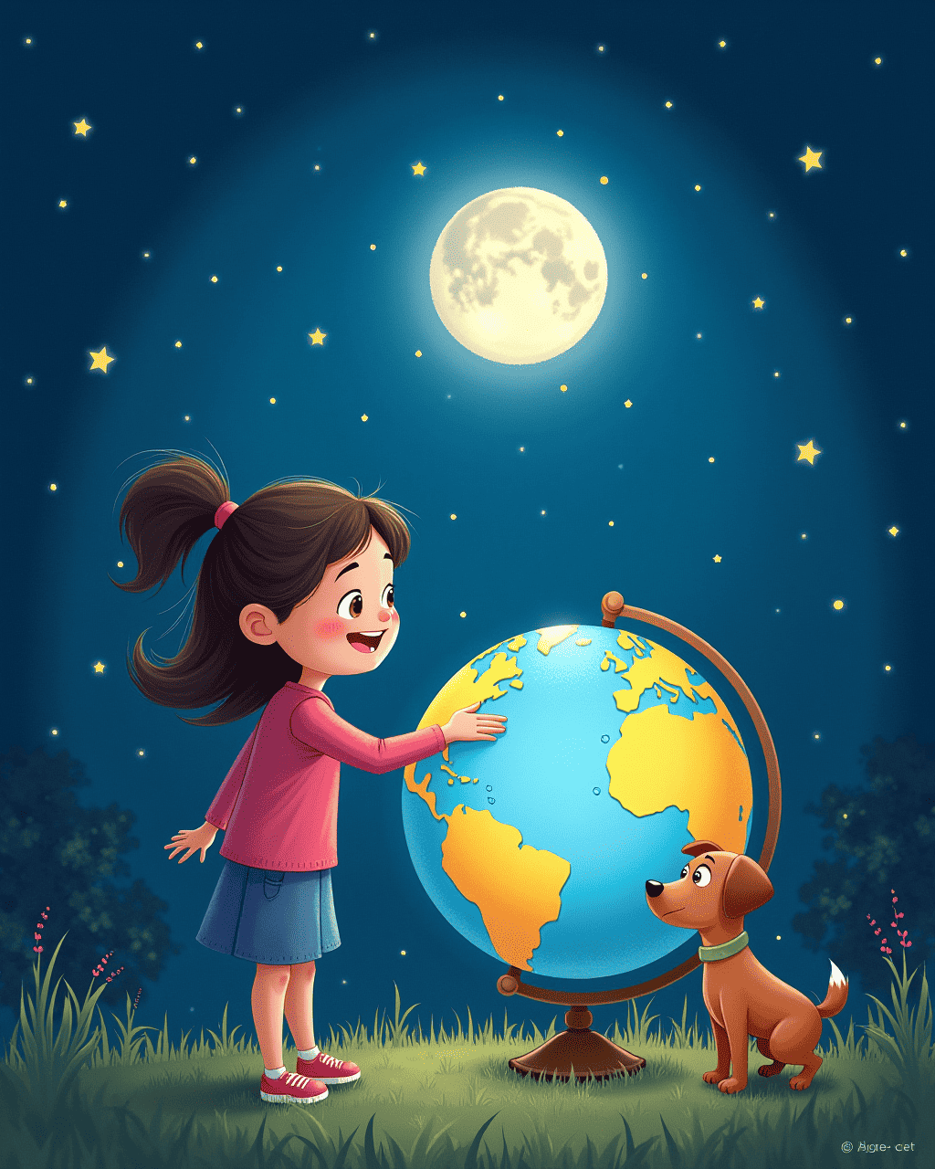Lucy pressed her palm against the smooth surface of the mysterious globe. The world above her seemed as ordinary as a backyard on a sunny day. Milo, her trusty dog, barked softly, echoing the thump of excitement. Suddenly, a faint humming rose from the globe, swirling hues of blue, pink, and gold. They both stared, knowing the adventure was about to begin.