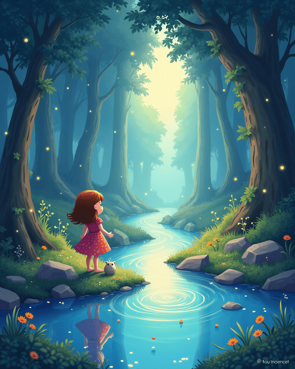 A river flowed beneath crystal pillars; its water glowed amber and silver. Each ripple reflected the colors of the globe. Lucy dipped her fingers gently and felt the water ripple like a heartbeat. Milo sniffed along the bank and found a strange stone that glittered like constellations. The adventure became a dreamlike procession of light.