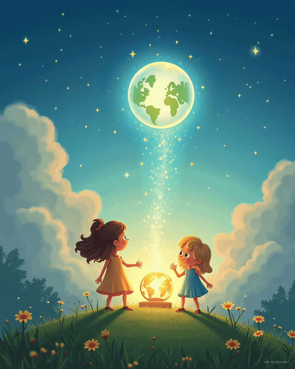 The final glow from the globe softened into a warm, gentle light. Lucy and Milo descended from the clouds back to the quiet meadow, their hearts full of adventure. The world around them seemed to breathe, and the soil rustled gently with the memory of their trek. When they placed back the globe on the mossy hill, it settled into a steady glow that promised new wonders. And in the twilight, they settled under a blanket of stars, dreaming of the next journey.
