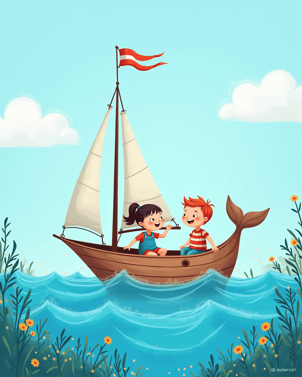 On a sunny day, Lily and her cousin Tom sailed into the ocean on a small boat. They saw waves that looked like dancing ribbons. The sky was bright, and the water glimmered. Suddenly, a gentle hum sounded from the depths. Lily turned to Tom, wondering what could be making that sound.