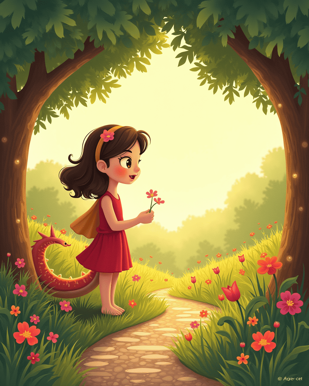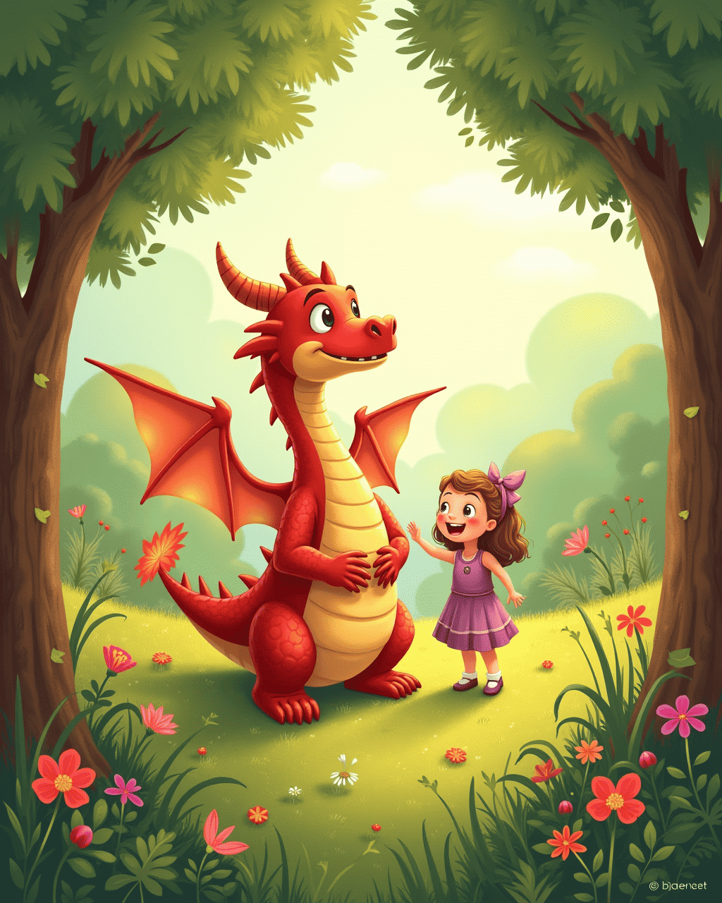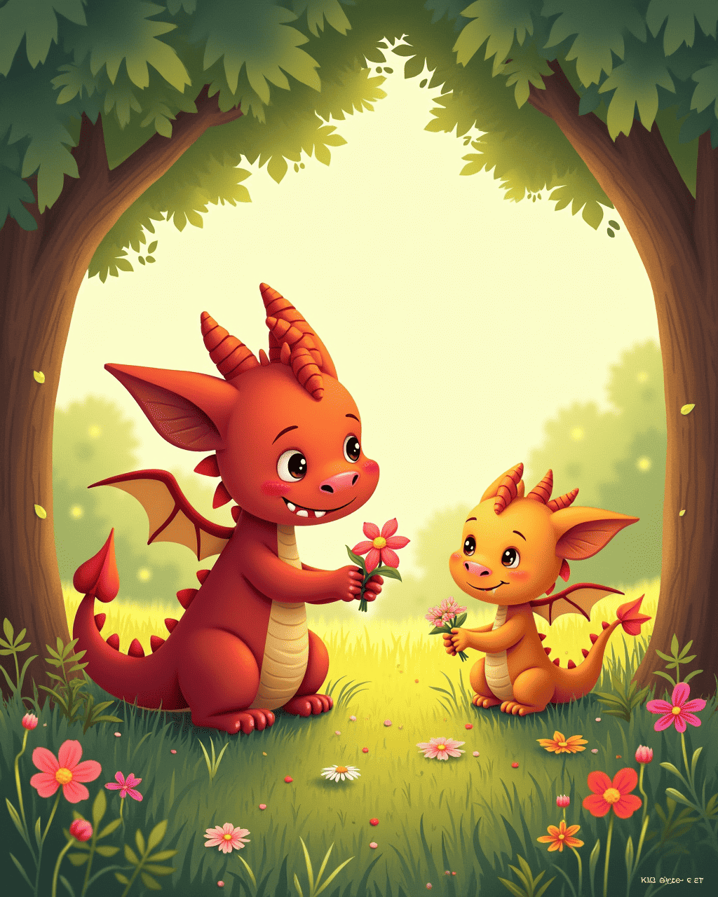 At dawn, Lily and the dragon found a patch of wildflowers. They gathered petals to create a small bouquet. Lily placed it near the old oak, and the dragon's scales glowed softly. The village children now understood that the dragon was not a monster but a friend whose feelings needed understanding. The story ends with the dragon happily resting under the oak, his anger turned into gentle friendship.