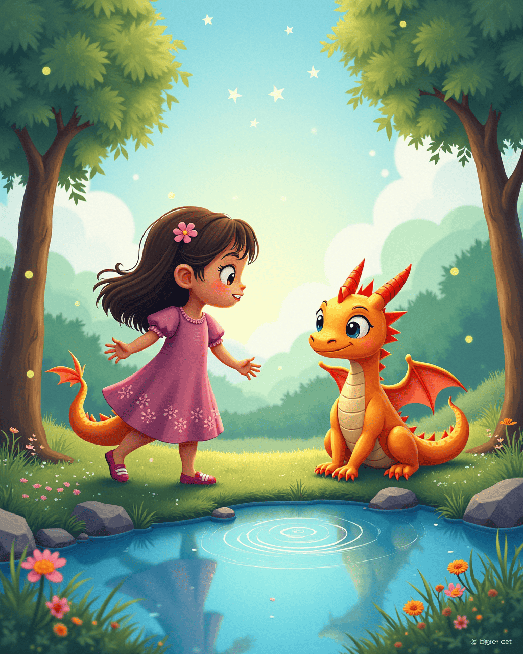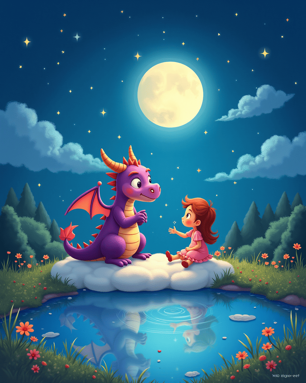 After the adventure, Lily sat on a cloud by the moonlit pond, watching stars. She shared her secret: she had always kept a journal to write down her happiest moments and her worries. The dragon listened, and his anger transformed into gentle gratitude. He gently touched Lily with his nose, and the wind whispered sweet memories of the day.