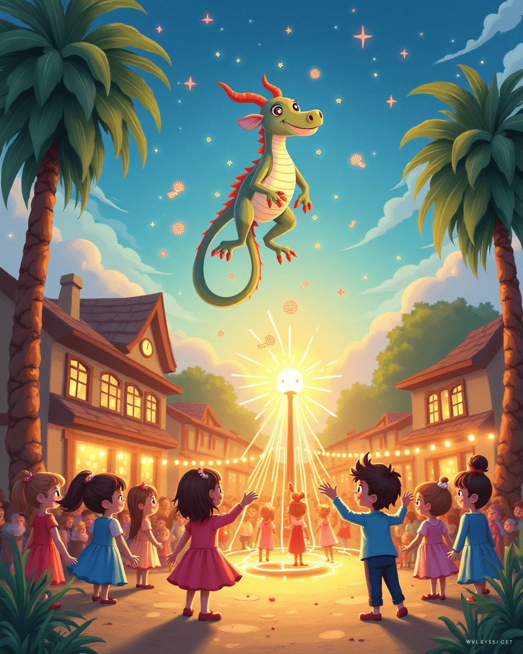 In the village square, Lily hosted a celebration. The dragon's flames are now colored fireflies. Children threw ribbons and danced. Everyone celebrated the end of fear, celebrating friendship. The village lived happily forever.