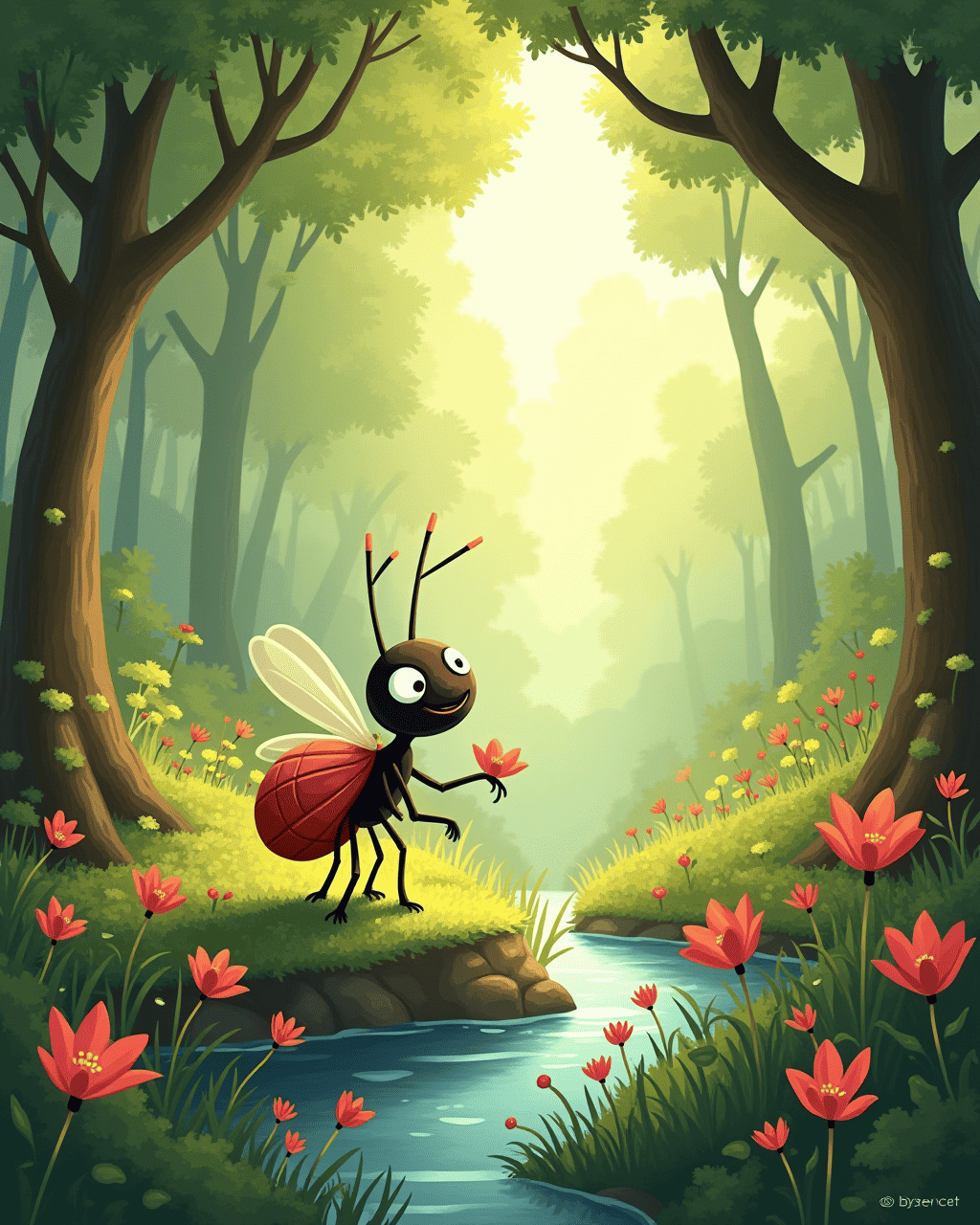 On the way back, Ada reflected on all she had seen and all the friends she had made. She carried the glow of the moonflowers in her mind, a reminder that adventure can be within one’s own heart. When she finally re-entered the anthill at dusk, her family welcomed her with open antennae. Ada shared her story, and the ants listened in awe, feeling the strength of courage that Ada had discovered. She realized that she could continue to explore, but now she was no longer alone—she had friends and memories to guide her.