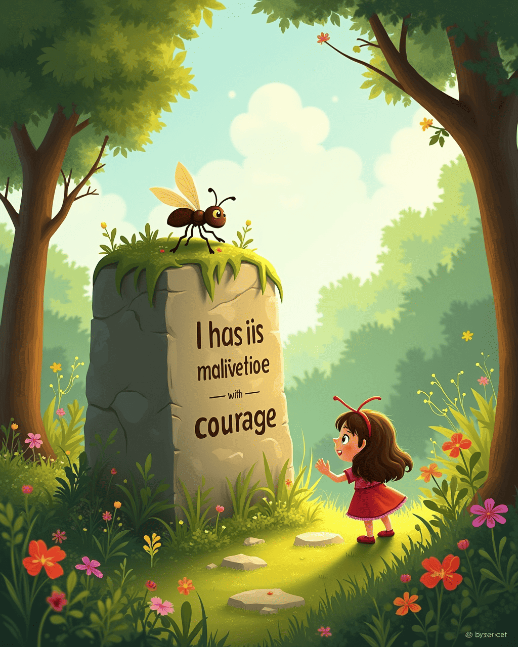 Near the edge of the forest, a giant stone block pressed into the earth, bearing a riddle in moss: “What keeps the sky from flying away?” Ada stared at the stone, pondering what the wise elders had taught her. She remembered: "Only a true seeker has the courage that is strong enough." With a smile she whispered, “I will solve it.” A golden beetle fluttered above the stone, and its wings shimmered to reveal the answer: courage.
