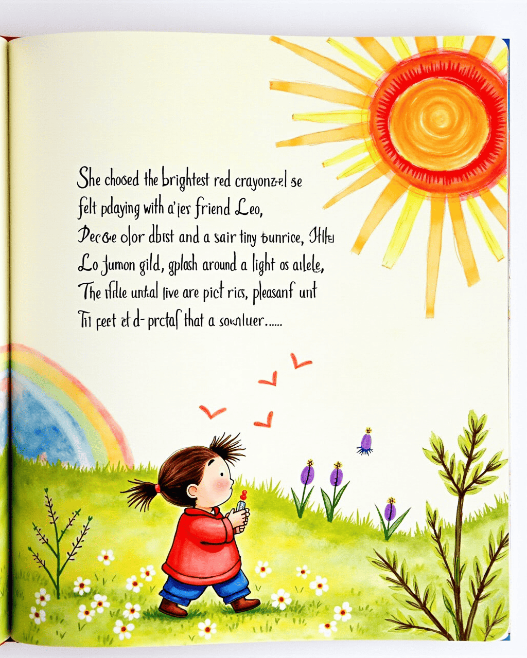 She chose the brightest red crayon to capture the joy she felt when playing with her friend Leo. The color burst across the canvas, swirling like a tiny sunrise. Little Leo laughed and his giggles turned into a splash of light around the painting. The villagers saw Mia’s art and felt a warm, pleasant hush. They asked her why the pictures seemed so alive.