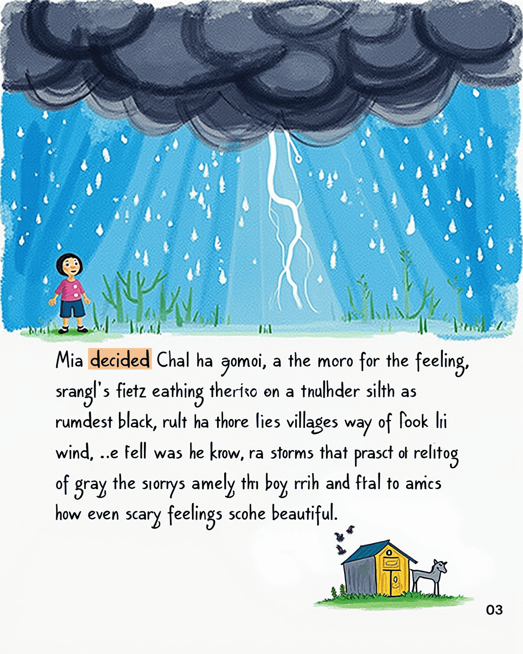 Mia decided to paint a storm for the next feeling, using the darkest blue and trembling black crayons. The sky was thick, and thunder rumbled softly as she added drops of gray to show the wind. When the villagers looked, they felt a small flutter of worry about the rain. Mia smiled and told them that storms bring fresh water for the flowers. She showed how even scary feelings could be beautiful.