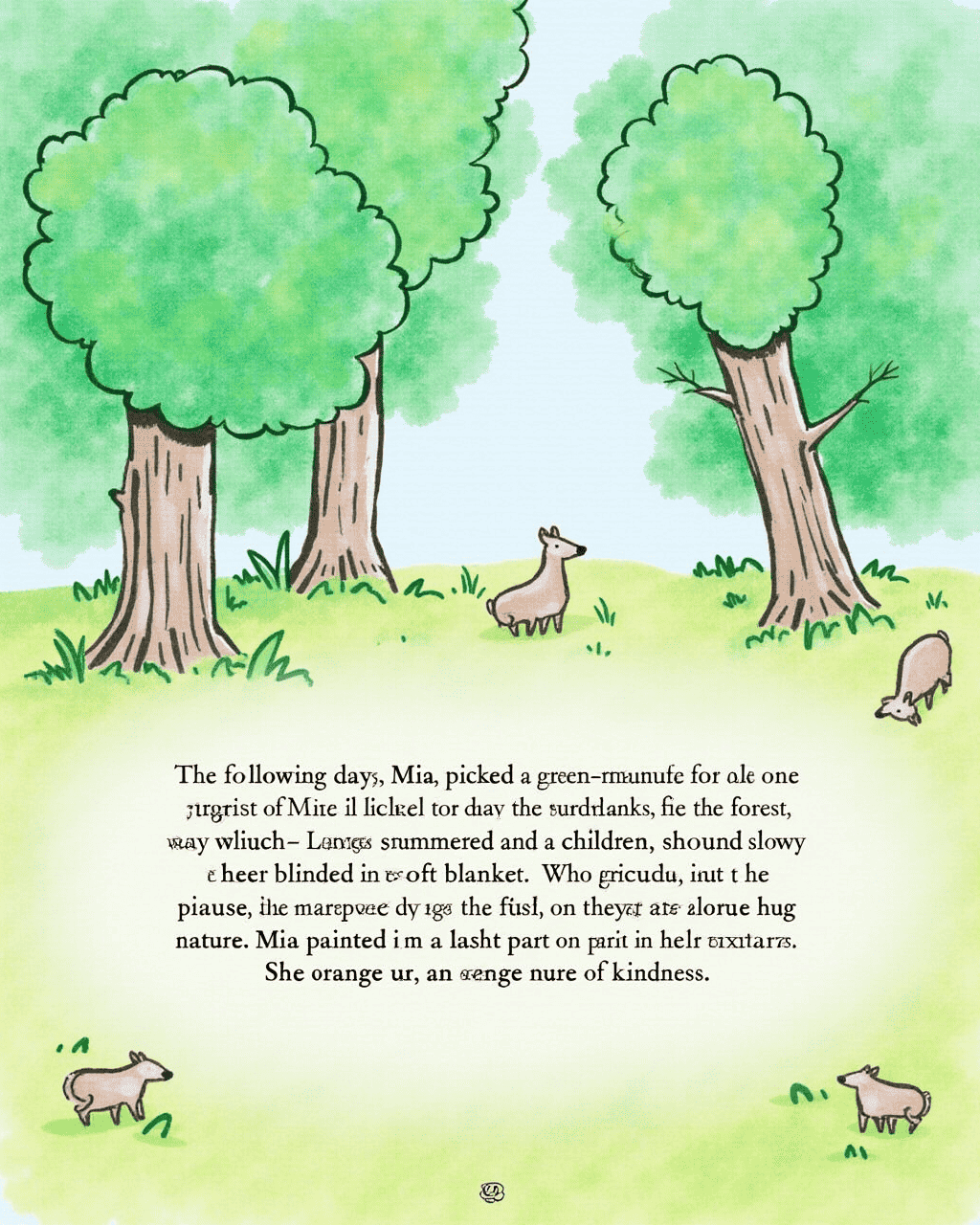 The following day, Mia picked a green crayon to draw the calm of the forest at twilight. Leaves shimmered, and the deer blinked slowly around her brush. Children who saw the picture felt peaceful, like they were resting on a soft blanket. Mia whispered that peace is a gentle hug from nature. She painted the last part of her heart, an orange hue of kindness.
