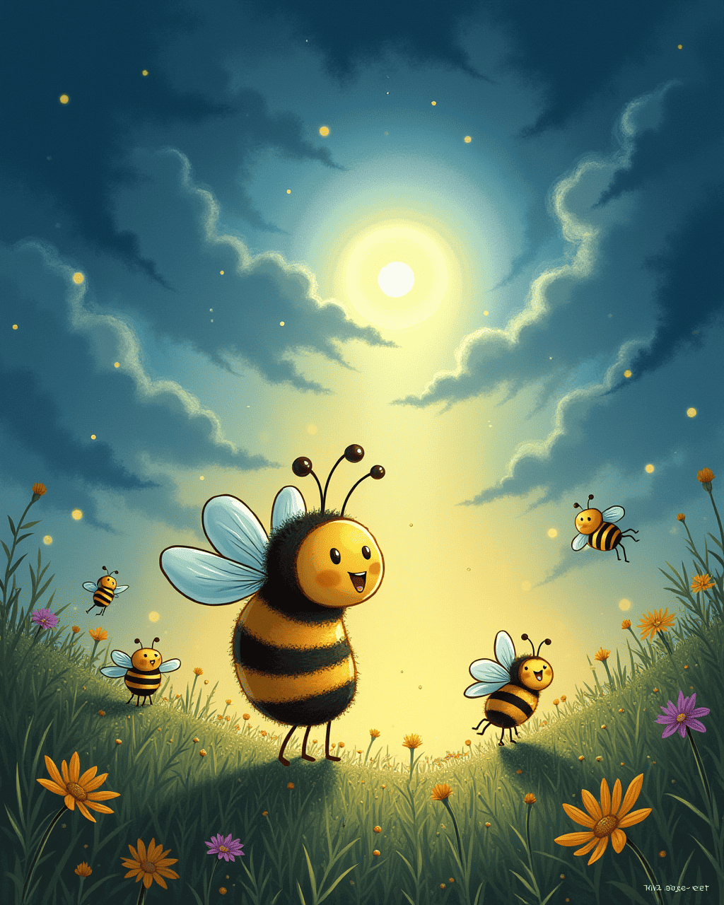 As the sun set, Bella’s story grew brighter in her mind. She added a heroic bee who saved a honey jar from the rain. The other bees fluttered around, listening to her rhythm of words. Bella felt proud when she finished the chapter about the bravery of bees. She made her heart flutter with butterflies of joy.