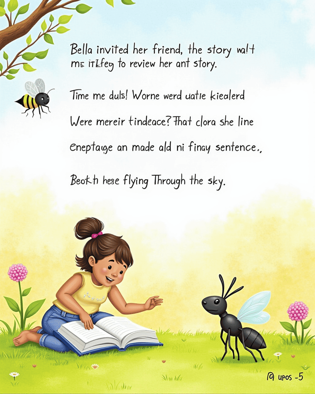 Bella invited her friend, the wise old ant, to review her story. The ant told her the words were clear and kind. He added a line about kindness that made the story sparkle. Bella thanked the ant and added the final sentence. She imagined the book flying through the sky.