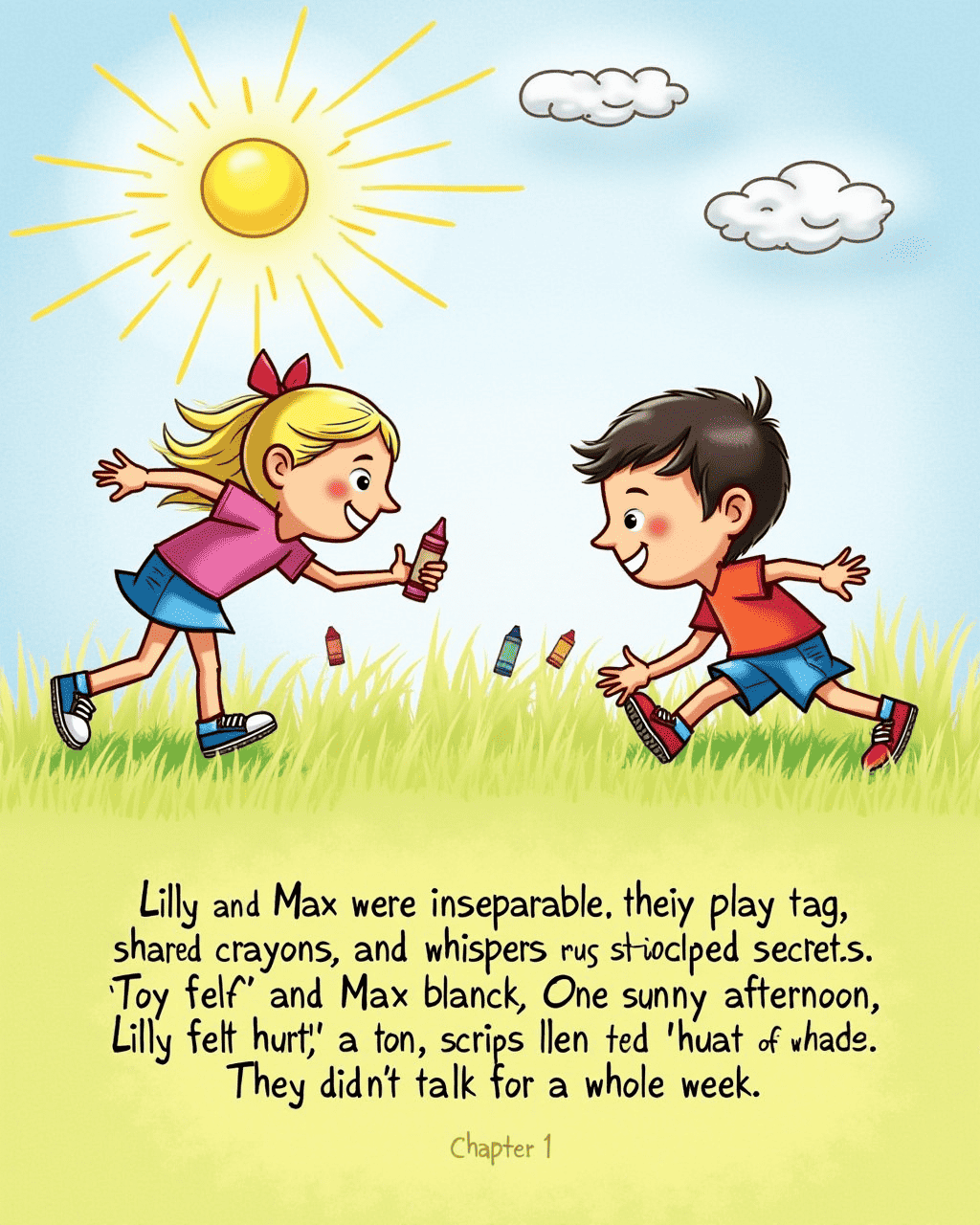 Lilly and Max were inseparable. They played tag, shared crayons, and whispered secrets. One sunny afternoon, a toy fell and Max blamed Lilly. Lilly felt hurt and stayed quiet. They didn't talk for a whole week.