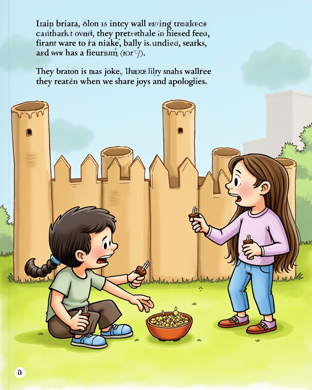 The fort rose from blanket walls and cardboard towers. They pretended to be pirates, saving treasure and sharing snacks. Max whispered jokes, and Lilly laughed loudly. They realized that friendship thrives when we share joys and apologies.