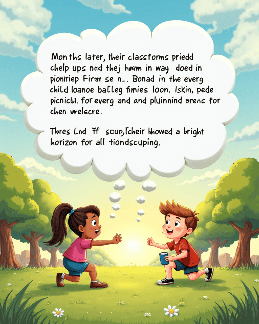 Months later, their classmates praised their team. They organized a picnic for everyone. Every child learned that talking helps overcome conflict. The end of their story showed a bright horizon for all friendships.