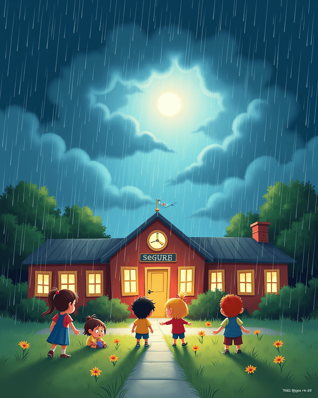 When Lily’s friends arrived, raindrops began to fall outside the school. The park was too wet for a picnic, so the group huddled inside the school gym. The lights dimmed to give the room a cozy glow. Lily and her friends shared jokes and games. Everyone laughed, turning the sudden rain into a joyful surprise.