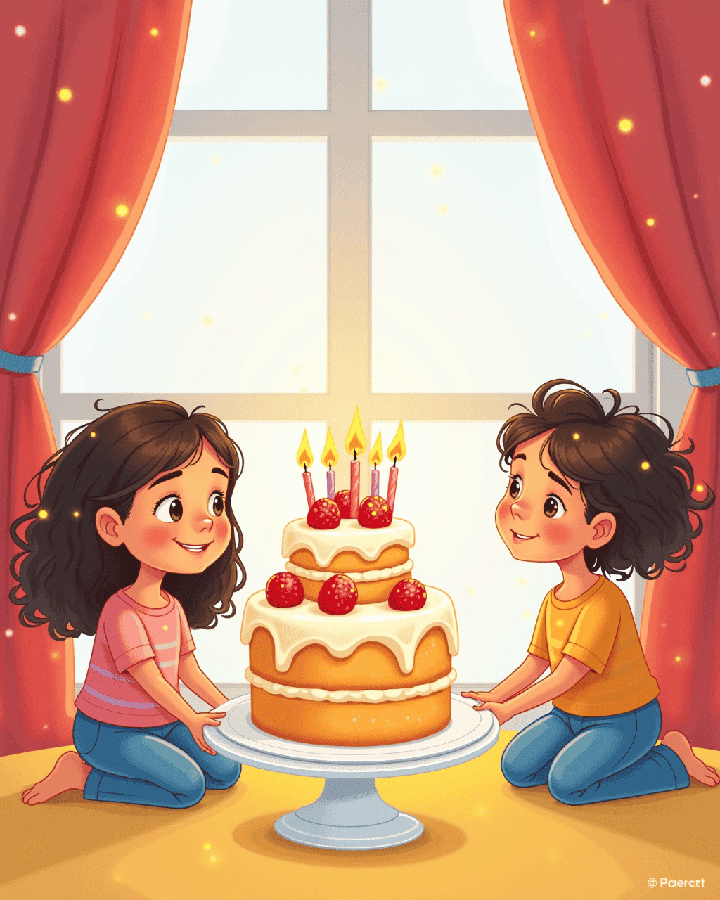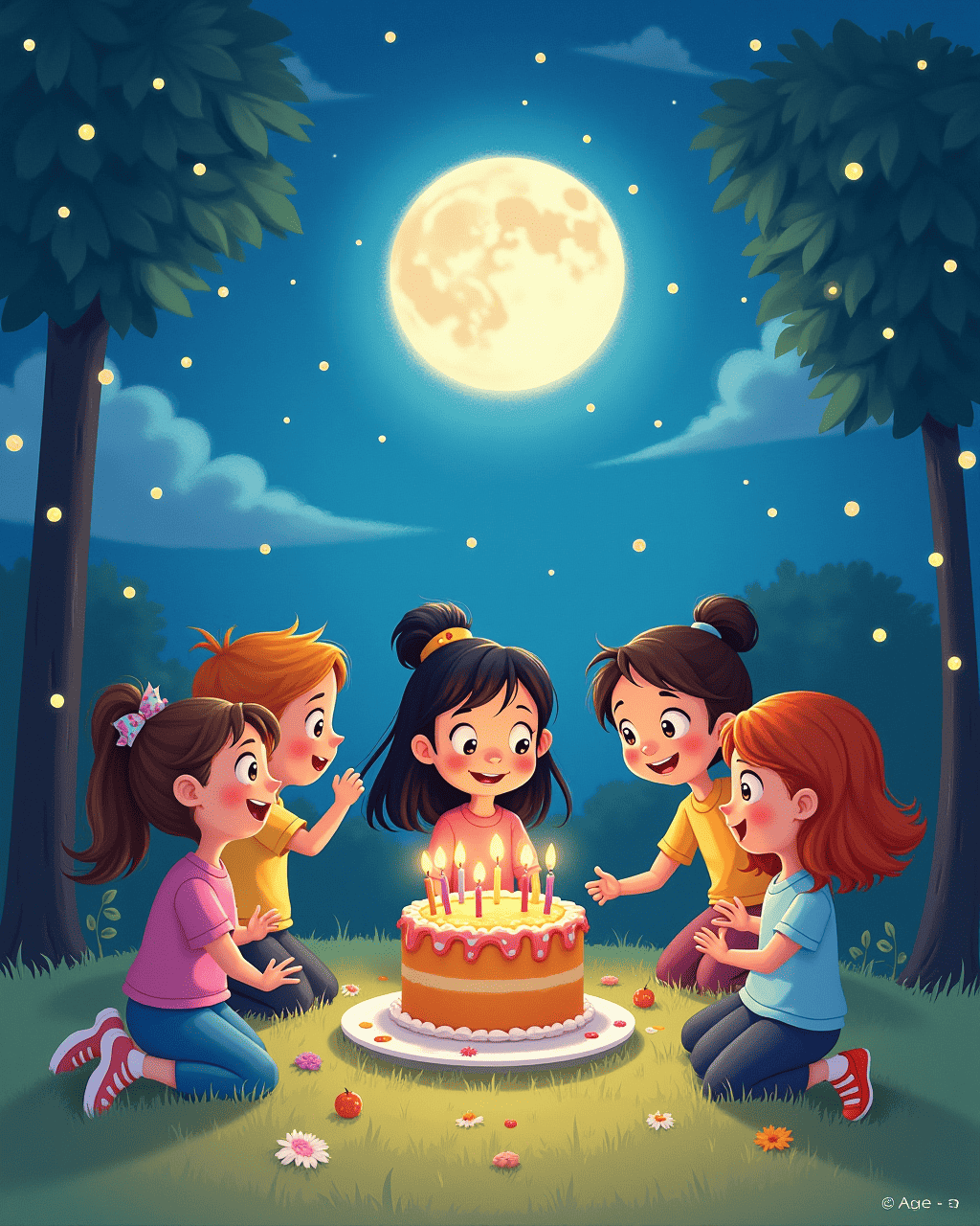 After the activities, Lily’s parents unveiled a big cake hidden behind a curtain. She gasped as she saw a tower of vanilla frosting and tiny lights. Her friends sang "Happy Birthday" and Lily closed her eyes to make a wish. When the candles were lit, everyone watched the gentle flames flicker. Lily felt pure happiness, knowing every moment was perfect.