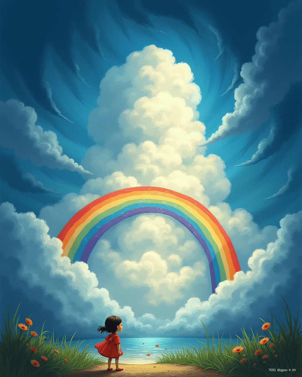 Lucy discovered that if she whispered a wish into the book, its words could rearrange themselves. She whispered, "Show me a rainbow bridge and a gentle breeze," and the page transformed. A rainbow arch crossed a cloud-filled sky, and the text described how to walk across it safely. The book seemed to listen, changing the adventure with her thoughts. Lucy felt her imagination breathe life into the pages.
