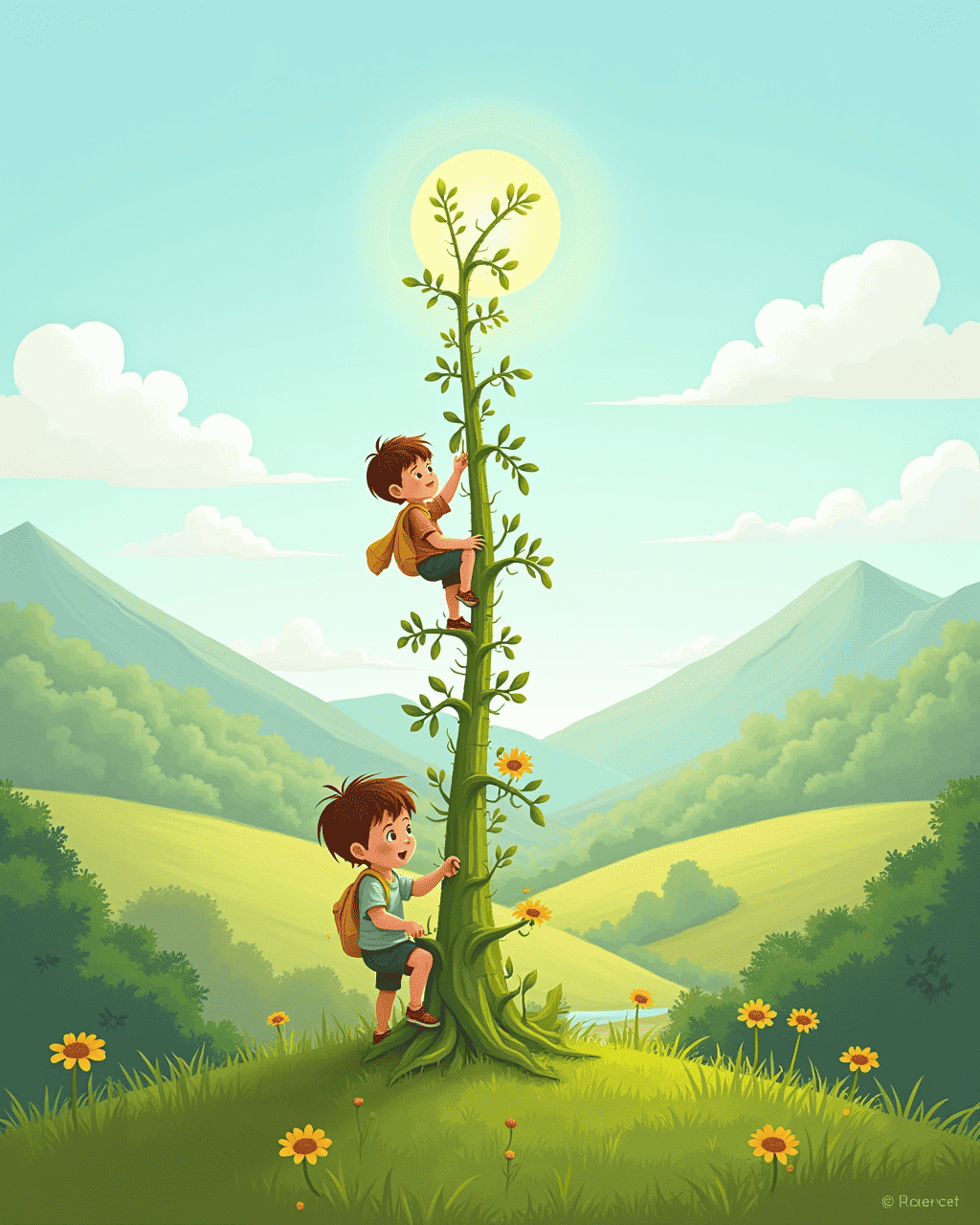 As the sun rose, the plant stretched toward the clouds. Timmy, curious, climbed up its vines to see the world from a new height. From the top, he could see the whole valley, the mountains, and the sea far beyond. The wind seemed to carry whispers of distant lands. Timmy realized that by growing, he could discover places he had never imagined. He felt the thrill of adventure, like a balloon soaring.