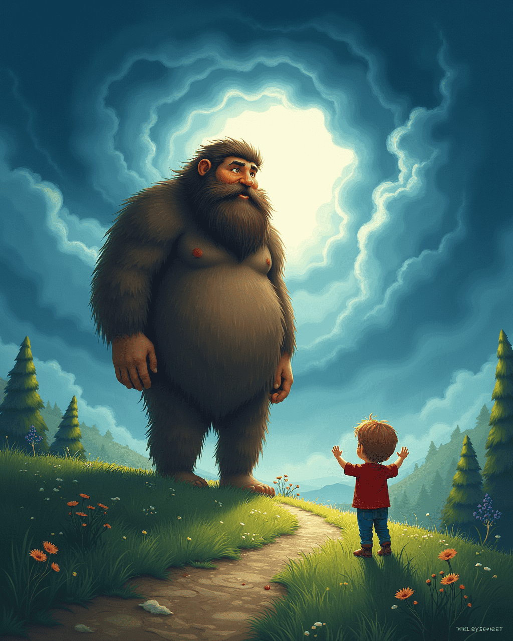 One day, a gentle giant named Garth stumbled upon the valley. He was lost after a storm had shattered his path. Timmy offered to help, climbing higher to show Garth the safest trail. Garth thanked him, praising Timmy’s bravery. The giant touched the sky with his hands, thanking the little boy for his guidance. Timmy’s heart warmed, feeling his own growth matter to others.