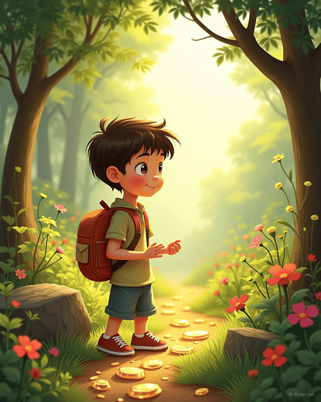 Tommy was a curious boy who loved to explore the forest behind his house. One bright morning, he spotted a sparkling trail of small gold stones glinting in the sunlight. He followed the trail, stepping over mossy logs and behind whispering trees. The stones made a gentle clinking sound as he picked them up, and he felt a rush of excitement. He knew that somewhere along the trail, an adventure awaited.