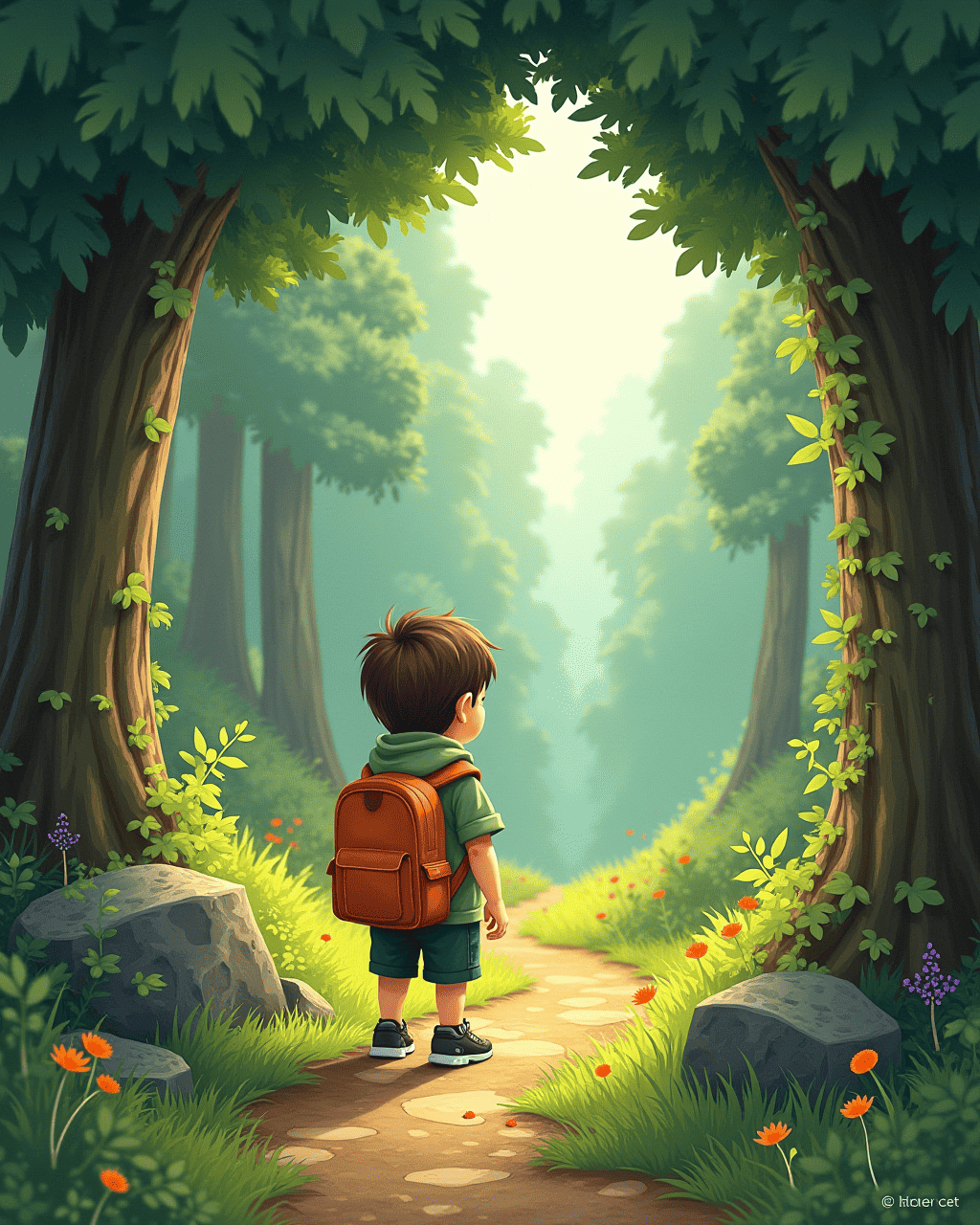 Deep in the woods, a soft voice called Milo's name like a gentle wind. He followed the sound through tall pines. The ground turned from leaf litter to smooth stone. The voice grew louder, guiding him to a mossy arch. Milo stepped through and felt the valley breathe.