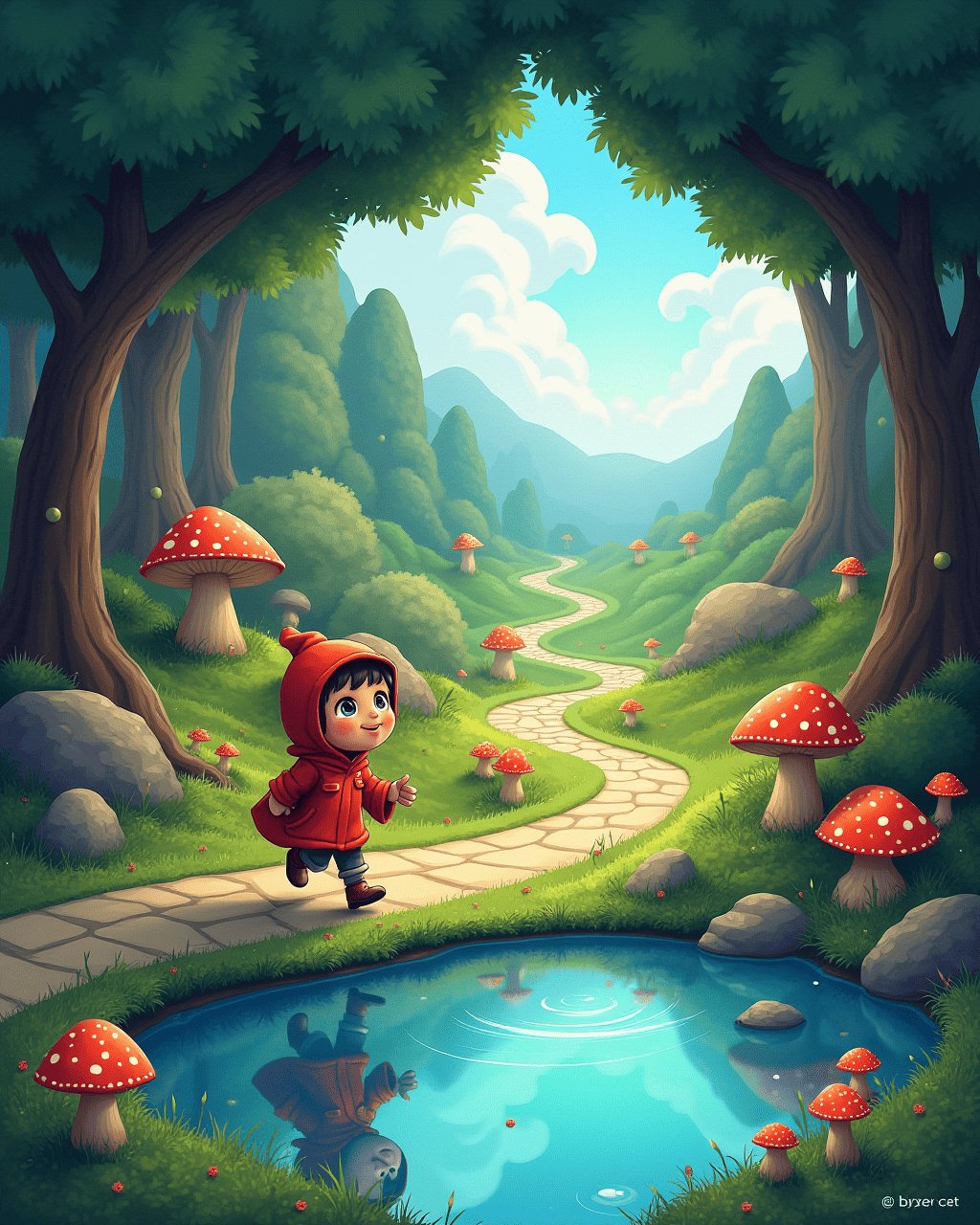 Beyond the arch was a winding path that twisted between glowing mushrooms. Milo hopped over stone bridges that sang when touched. He laughed when a friendly rabbit hopped beside him. The path led to a crystal pool reflecting the sky. The water shimmered with hidden colors.