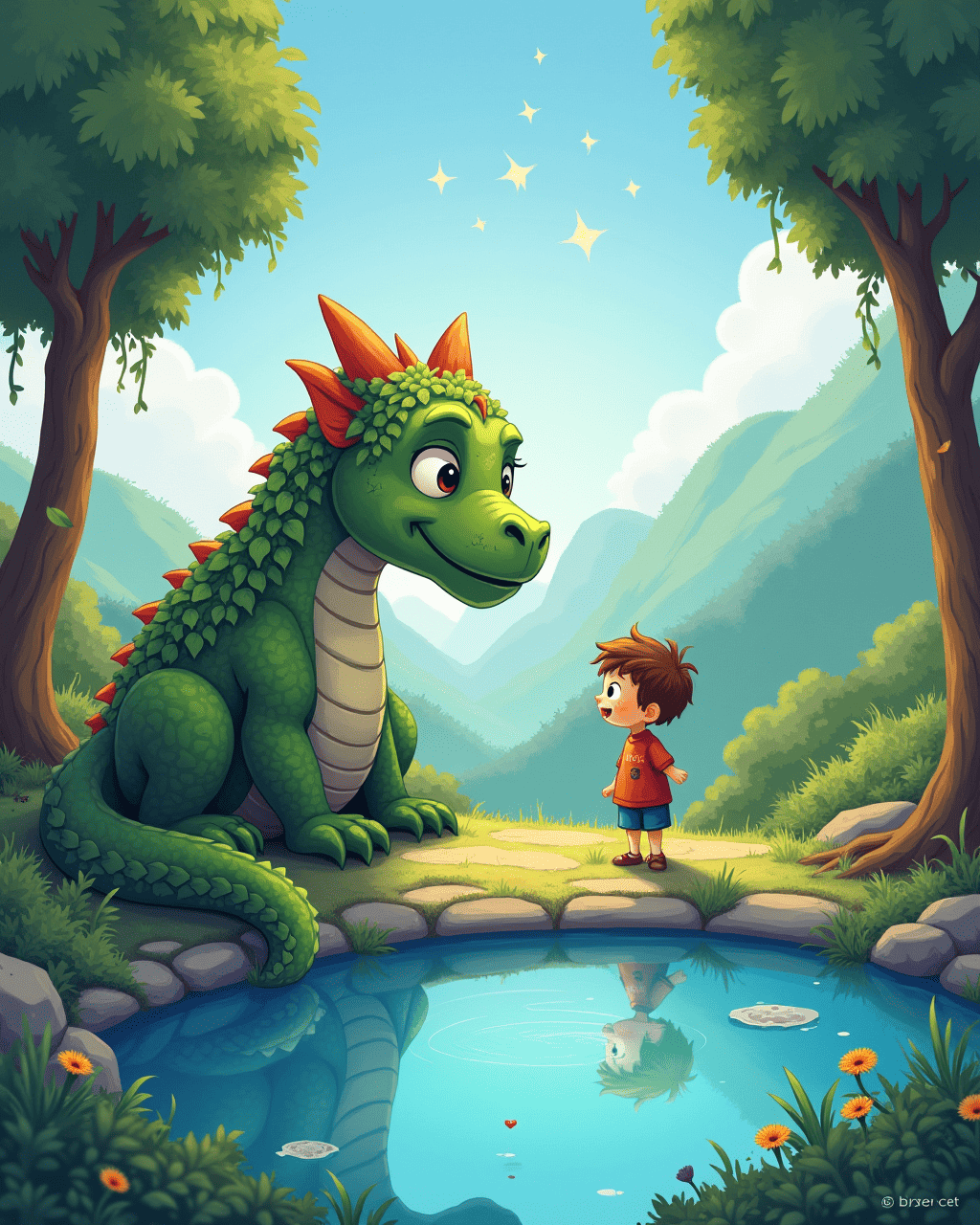 At the pool’s edge sat an ancient stone dragon covered in ivy. Milo approached slowly, showing respect with a bowed head. The dragon spoke in a riddle, “Seek the map that lies in the wind.” Milo nodded, absorbing ancient wisdom. The dragon then vanished, leaving behind a sparkling feather.