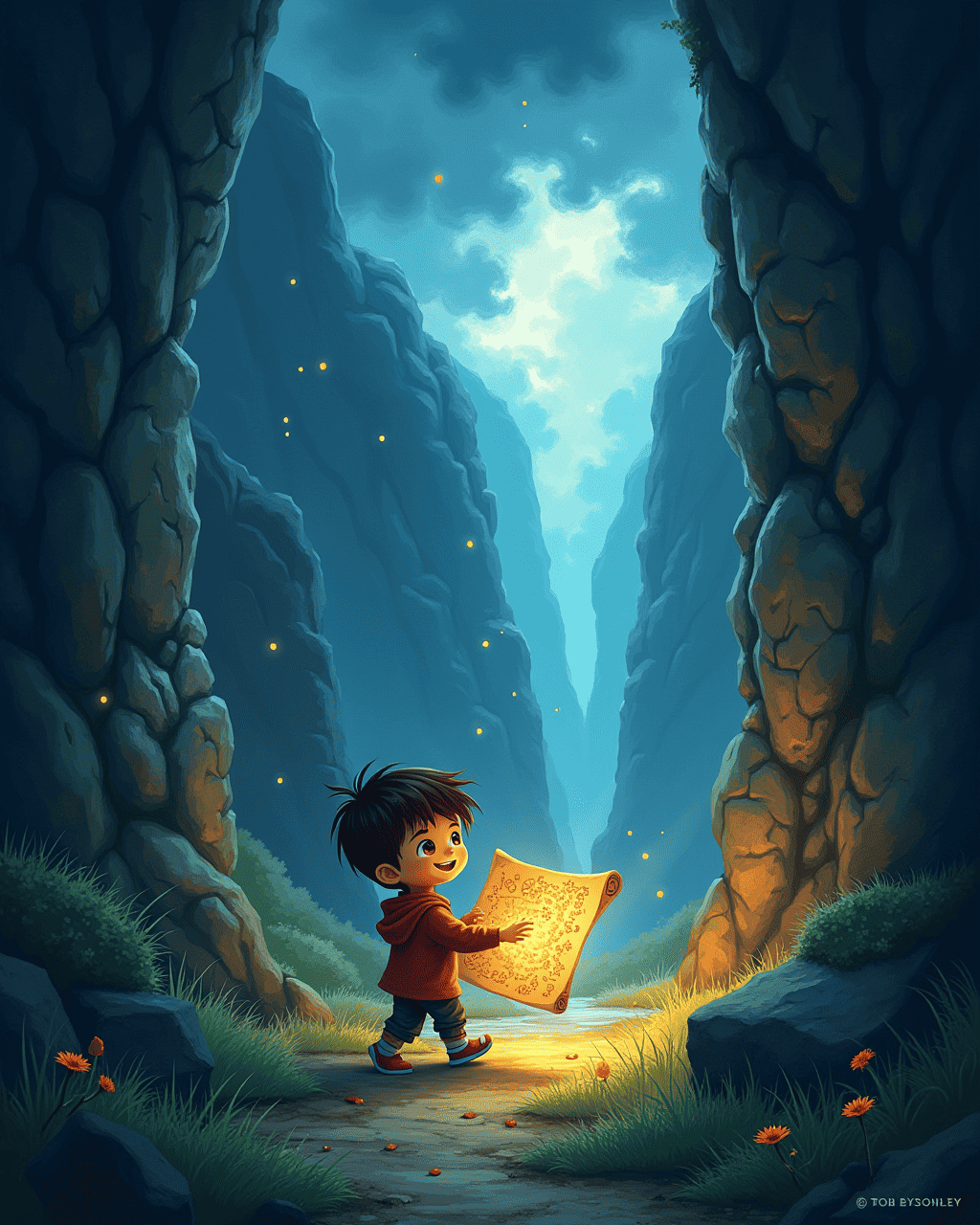 Milo chased the feather into a canyon where cliffs sang with windy echoes. He discovered a hidden cave etched with glowing runes. Inside was a parchment map of unseen caves. The map glowed brighter when Milo held it close. He realized this map would guide him to the valley’s heart.