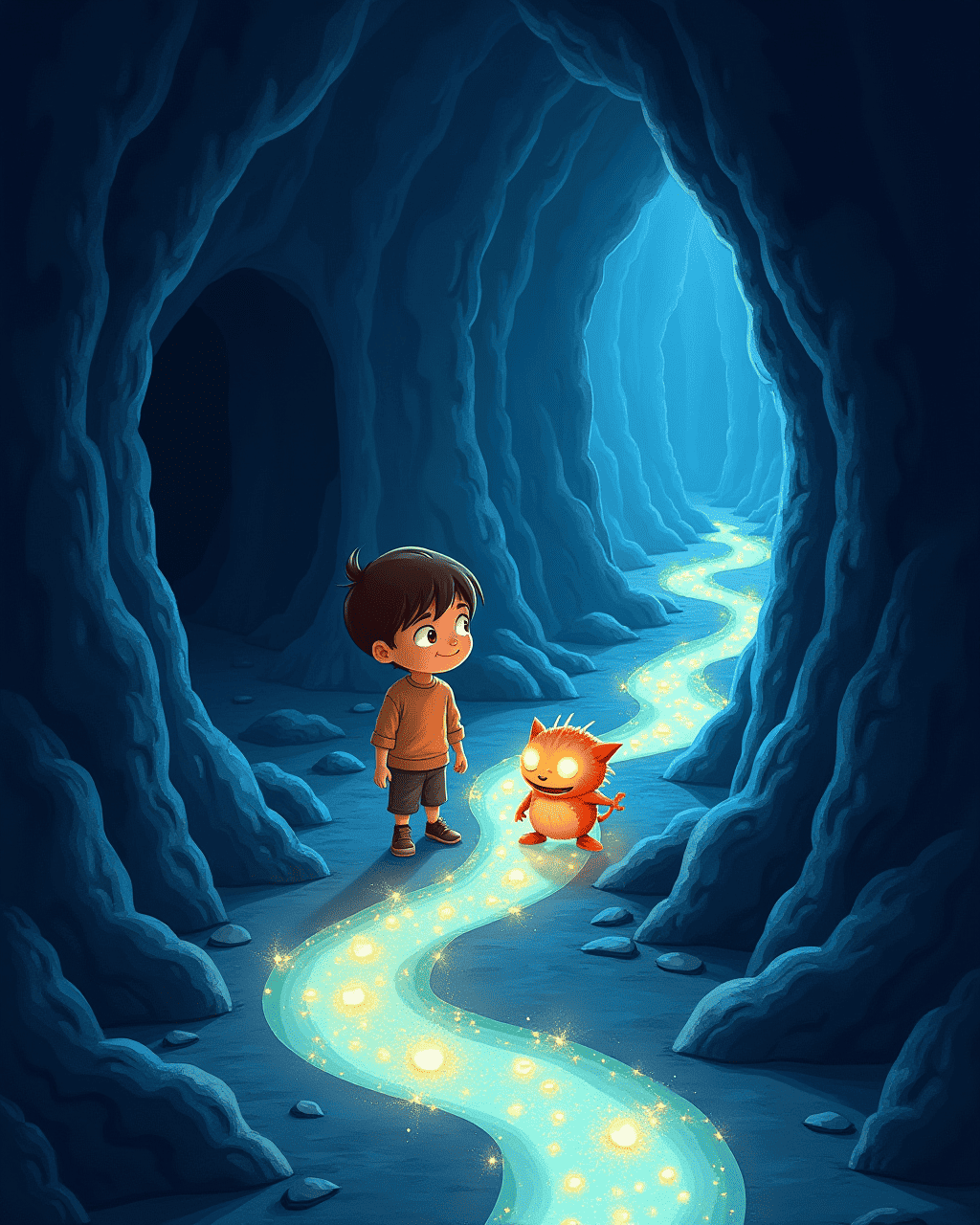 As Leo entered the shadowy cavern, a small creature with sparkling eyes appeared. It bowed politely and introduced itself as Glimmer, the glow-monster of the cave. Glimmer offered to light their way through the tunnels. Leo accepted and the darkness turned into a shimmering path. The two friends laughed softly at the cool river of sparkling lights.