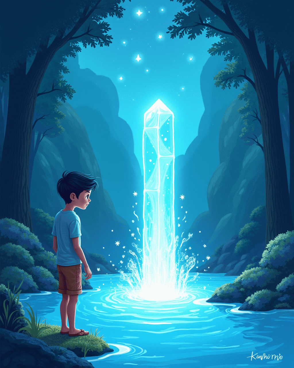 Further down the trail, they discovered a crystal lake reflecting the stars above. To Leo’s surprise, the water rose in gentle waves singing a friendly tune. Glimmer told Leo that the lake was a gate to a secret garden only seen at night. They splashed in the crystal water together, feeling the cool mist on their faces. Leo wrote the moment in his small diary carried in his pocket.