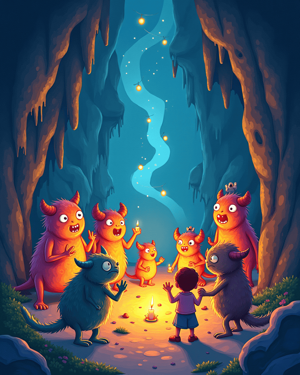 The monsters of the cave gathered for a festival in the cavern’s clearing. Lanterns hung from stalactites and music floated from crystal pipes. Leo danced with Glimmer and the other friends while learning the cave’s secret dance moves. Candles of fireflies burned bright, and the monsters shared snacks of sweet moonberries.