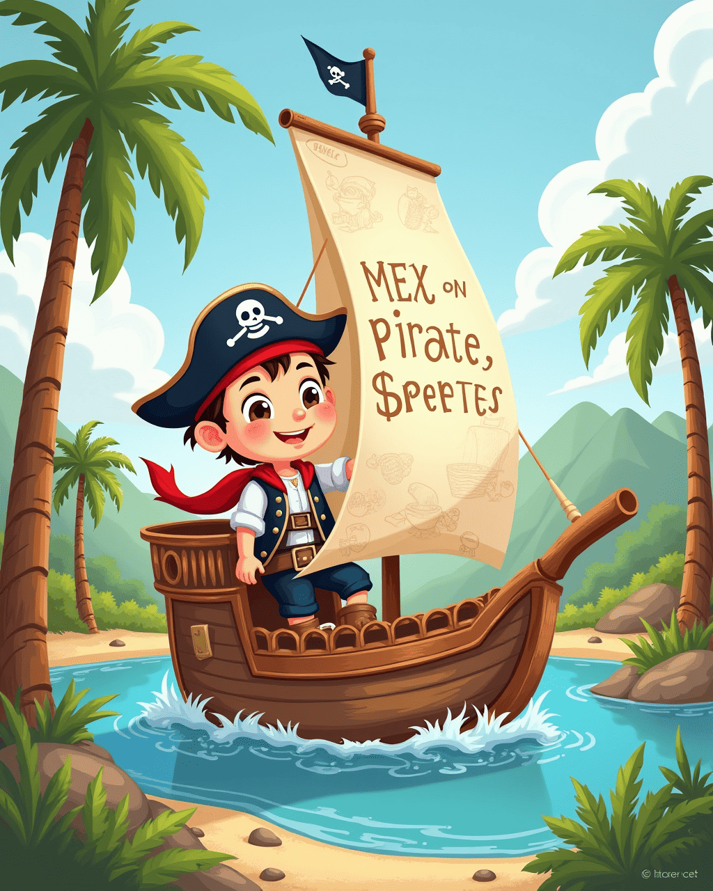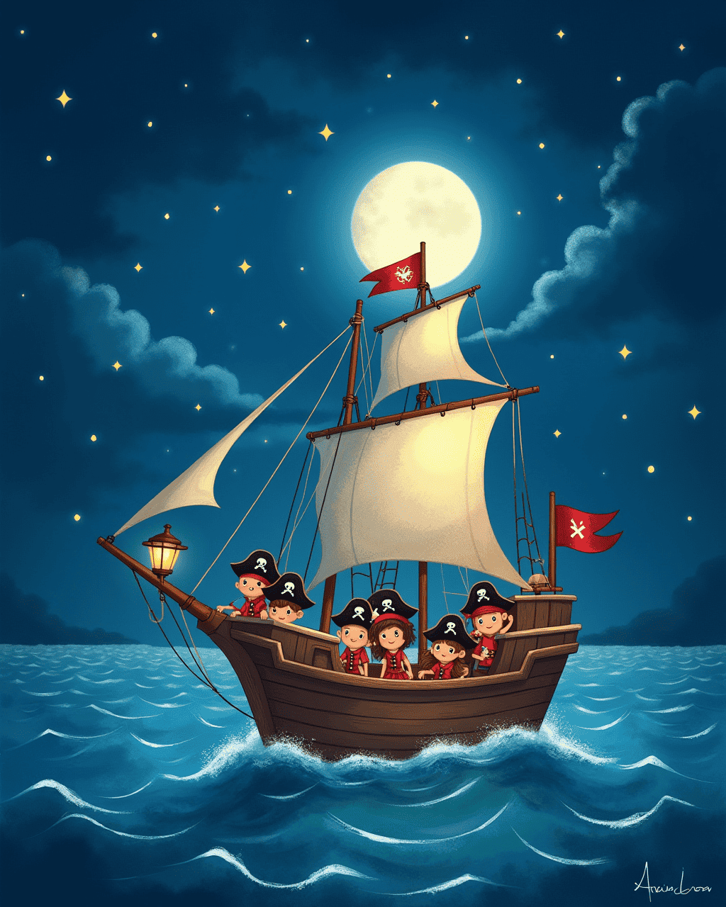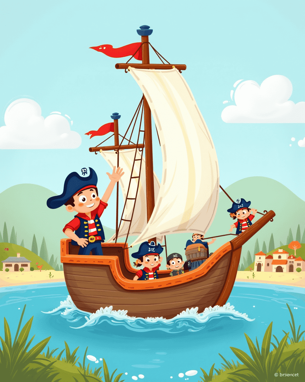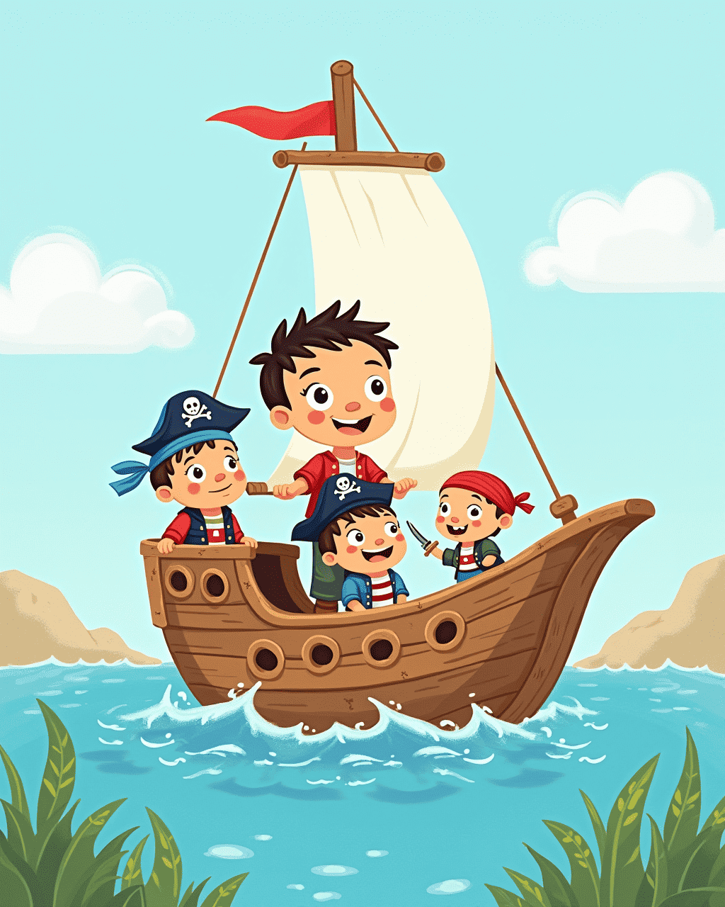 Tommy stepped into the shallow waters and saw tiny wooden figures bobbing in the waves. They were miniature pirates, wearing tiny hats and swords. Suddenly a voice shouted from the deck, “Ahoy, landlubber!” Tommy laughed; the pirates looked just real enough to talk. They welcomed him aboard, promising to teach him how to navigate the seas.