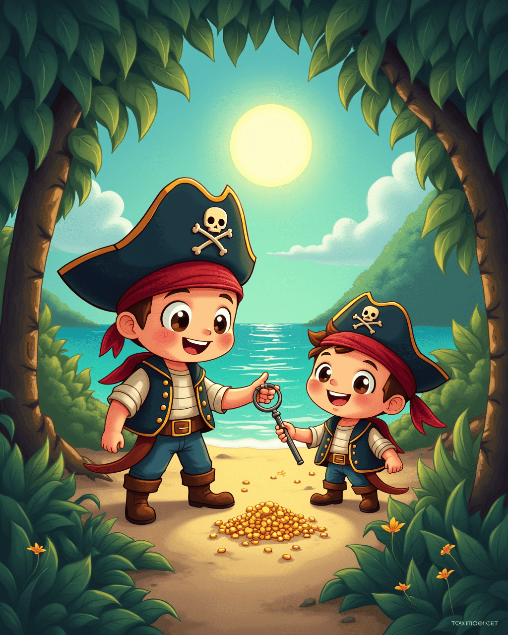 At dawn, the compass flashed a bright green light, pointing inland. They trekked through a maze of vines until they found a cave etched with sea‑tide symbols. Inside, the shining chest was locked with a silver key. The small pirate handed Tommy the key, and he turned it with a gentle click. Treasure glittered inside, but the real treasure was the friendship they shared.