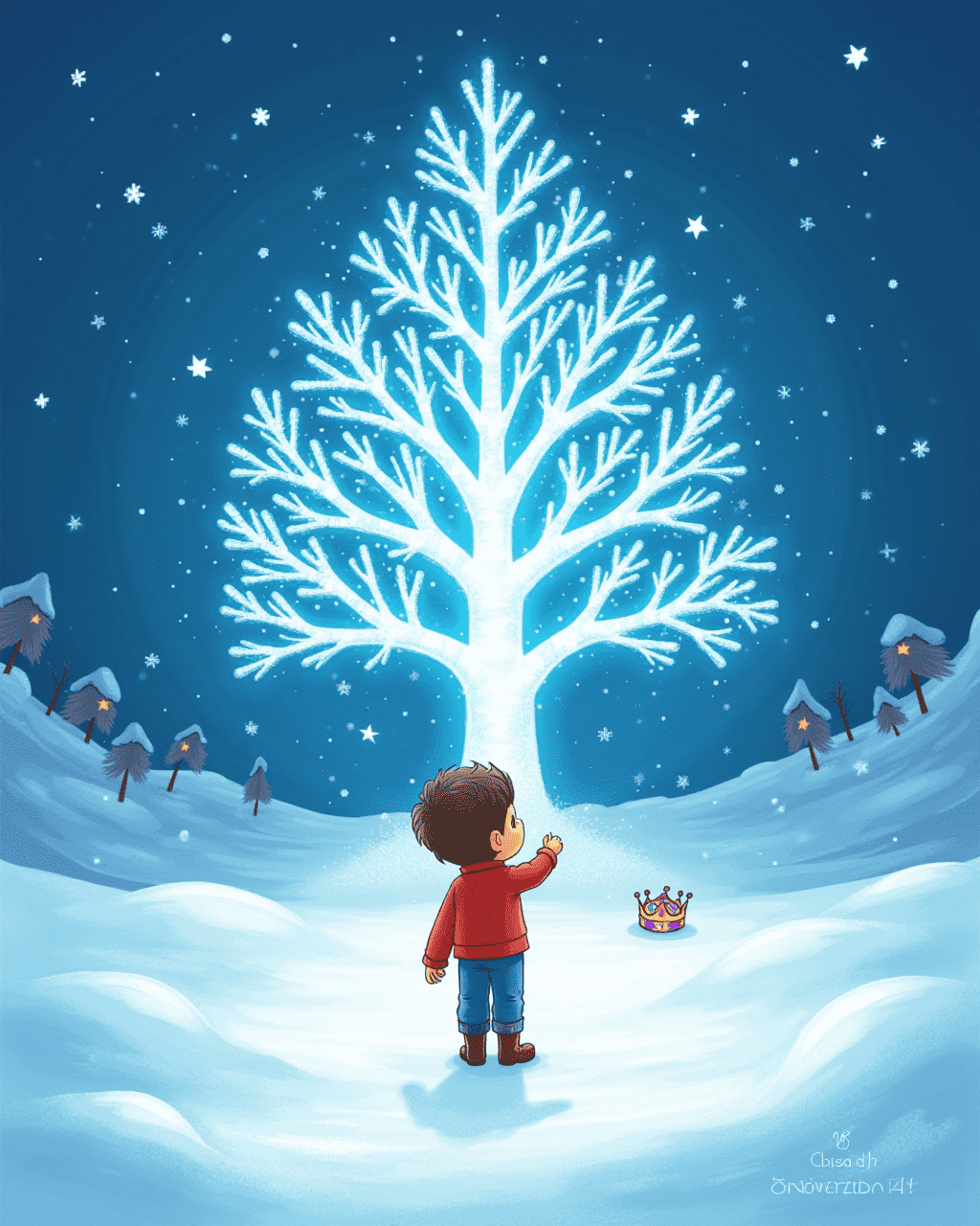 Finn was playing in the snow when a sparkling glow caught his eye. He followed the shimmering trail to a clearing where a silver tree glowed with frost. At the base of the tree lay a tiny crown made from crystal snowflakes. The crown glittered with colors that danced in the cold wind. Finn felt a gentle pull, as if the crown was calling his name.